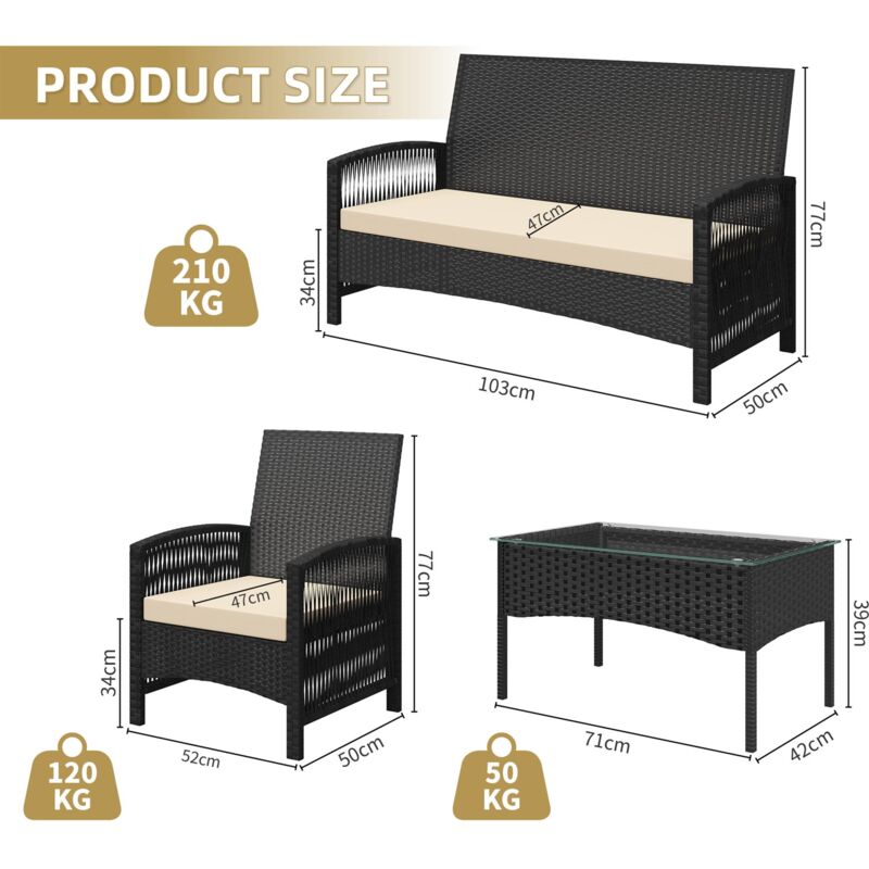 Introducing our 4-piece rattan furniture set, perfect for creating a cozy outdoor seating area for you and your family. This set includes two chairs, one sofa, and a coffee table with a tempered glass top, providing ample space for relaxing and entertaining. Designed with comfort in mind, the thick padded water resistant cushions offer a luxurious seating experience and the covers are easily removable for cleaning convenience. The curved arm design adds a touch of elegance to the set, enhancing its visual appeal. Crafted with a sturdy metal frame and PE rattan, this furniture set is built to last and requires minimal maintenance making it the perfect choice for outdoor use so you can make memories with your family and friends for years to come.