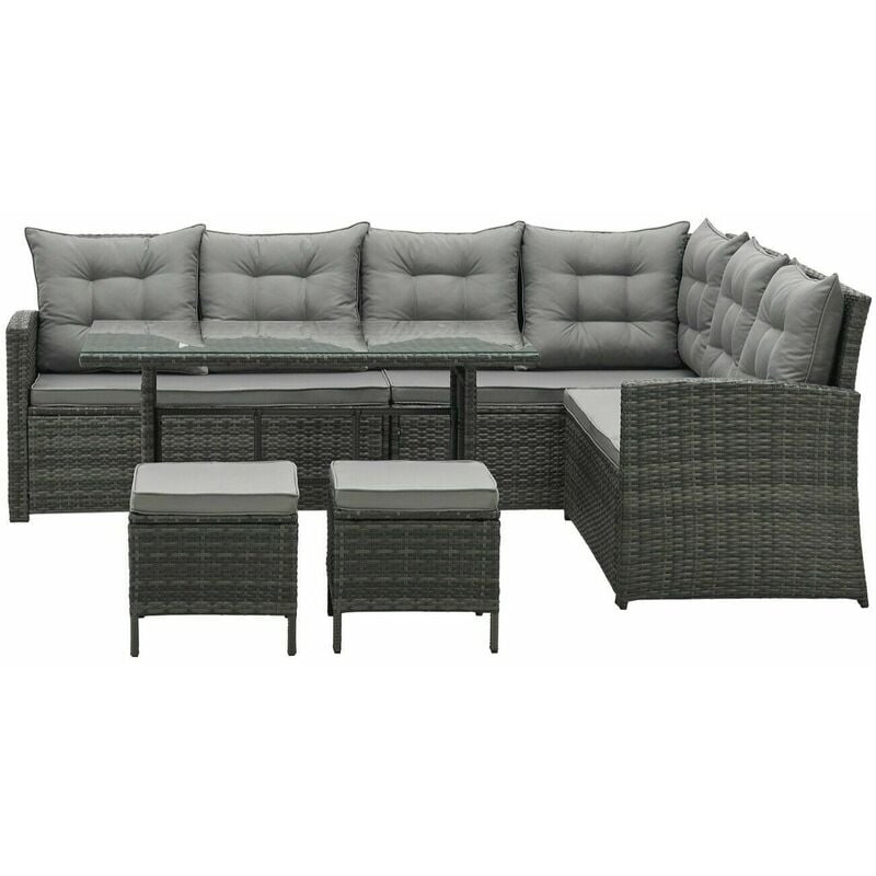 The Evre Monroe Modular Corner Outdoor Set is ideal for al fresco dining and entertaining. It includes a three-seater, a two-seater, a corner unit, two footstools, and a dining table, making it perfect for family gatherings or summer parties. The set is both practical and stylish, featuring PE rattan and comfortable cushions that enhance any outdoor space.