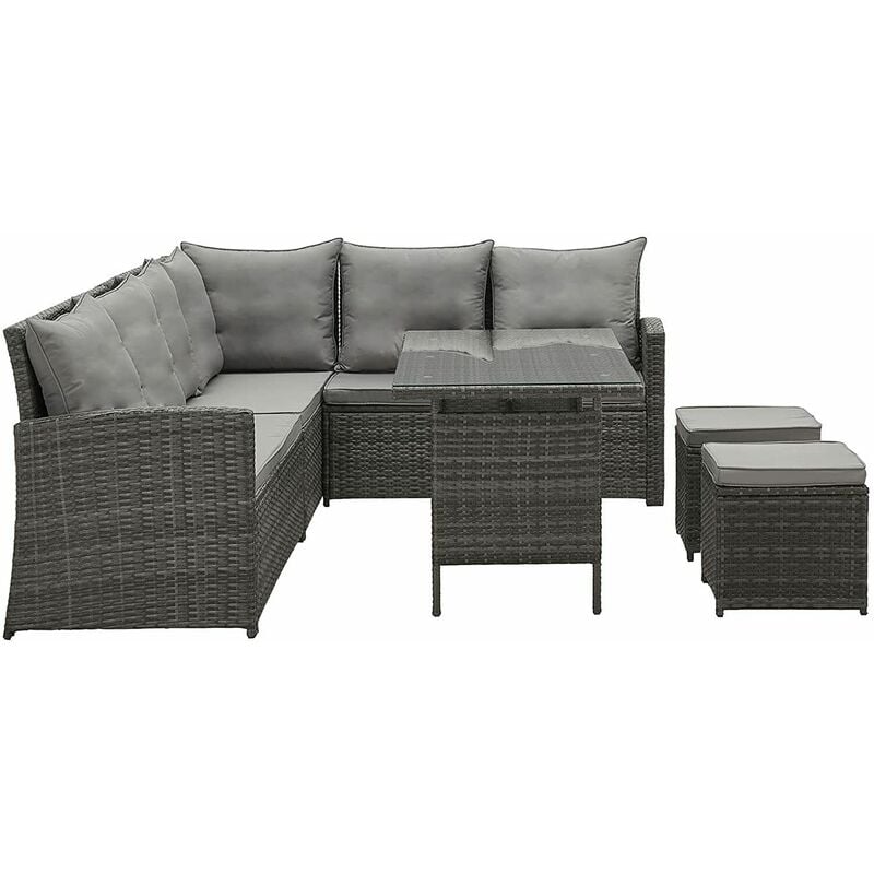 The PE rattan and glass top are easy to clean with a damp cloth. Cushions are dirt resistant and shower-proof, and can be hand washed.