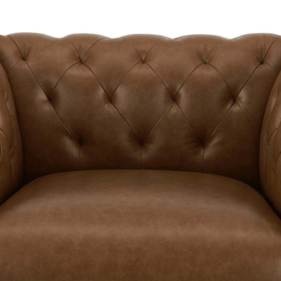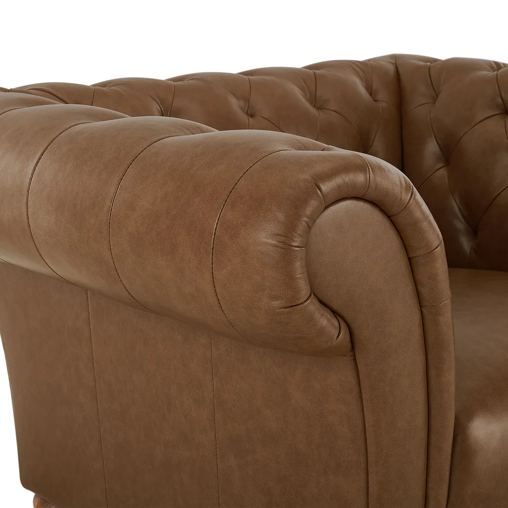 Characterised by deep tufted detailing, scroll-top arms and turned oak feet, the Montgomery armchair has a warmth to it that makes it ideal for traditional study or reading room aesthetics. The real leather upholstery provides an additional layer of sophistication while making this armchair an extremely comfortable and easy-to-live-with addition to any home. A matching 2-seater sofa, 3-seater sofa and footstool are also available.