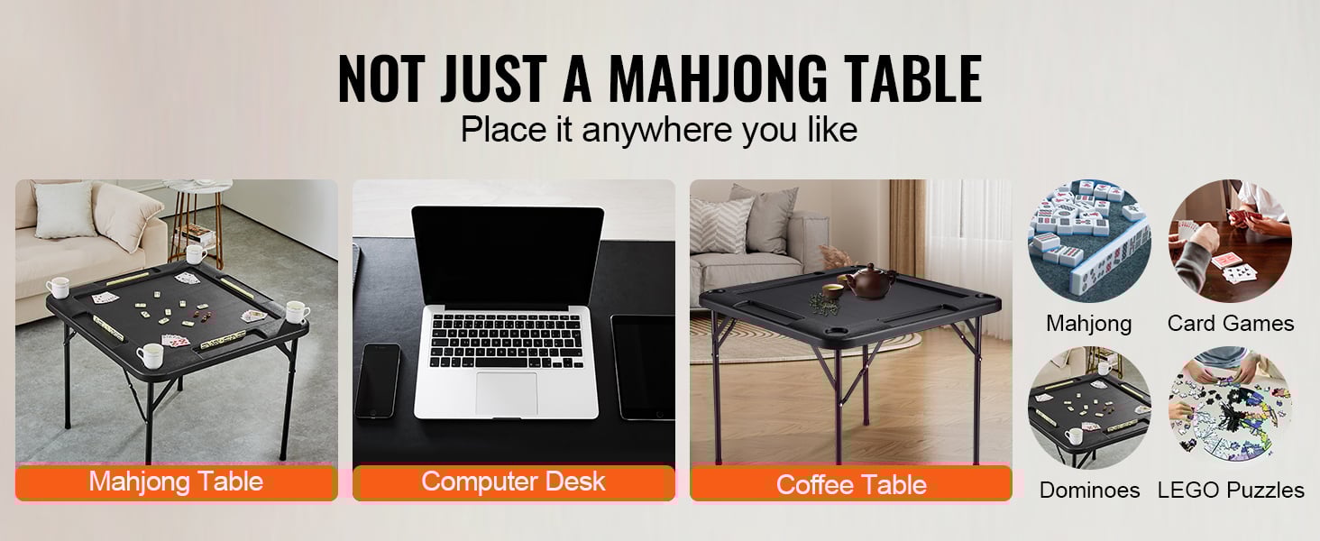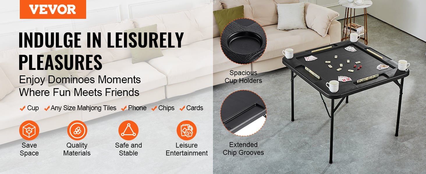 Elevate your gatherings with VEVOR folding mahjong table, perfect for enjoying leisure time with family and friends. With its convenient cup holders, you can easily keep your drink nearby. Plus, the chip trays allow you to keep your phone, chips, and cards neatly organized and easily accessible.