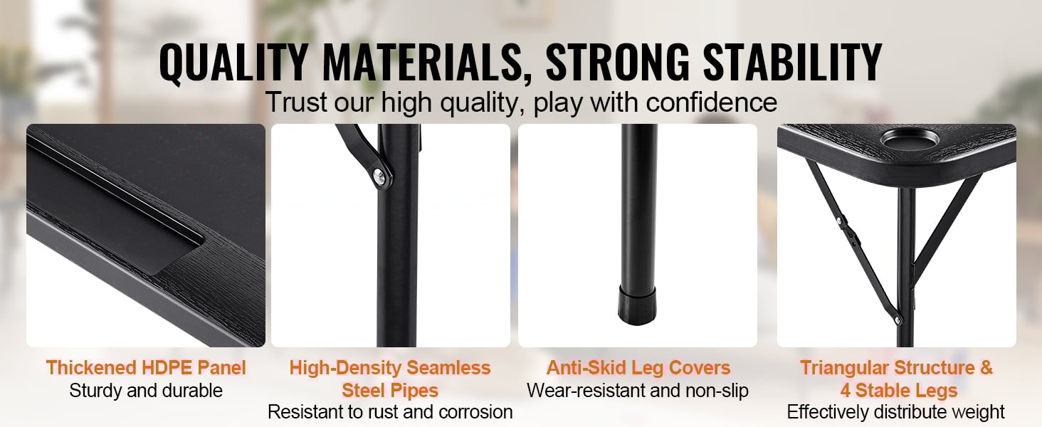 - Sturdy and Durable: Our 4-player folding card table-top is made of high density polyethylene(HDPE), durable and waterproof. Its high-density seamless steel pipe is rust-resistant, while the non-slip foot pads enhance stability, reduce noise, and resist wear. With outstanding load-bearing capacity, it provides excellent stability during playtime.