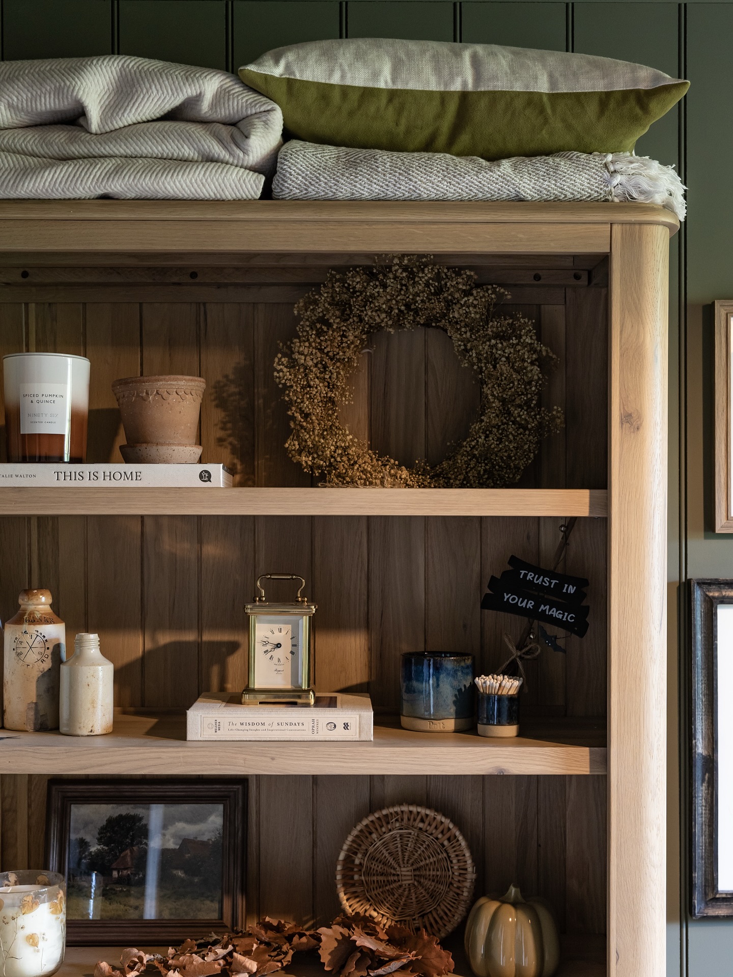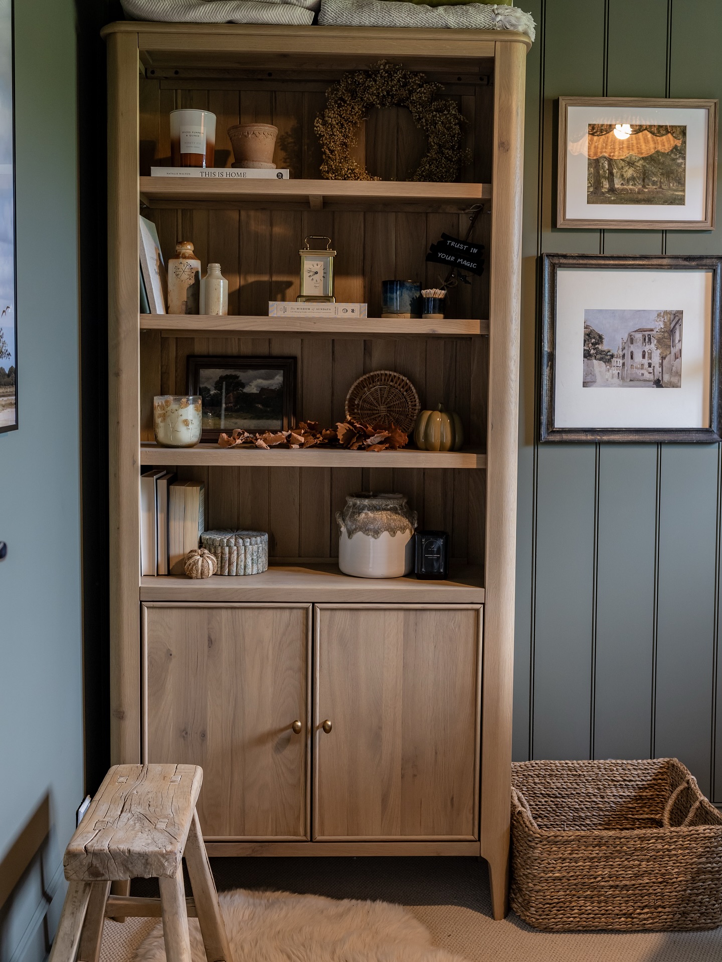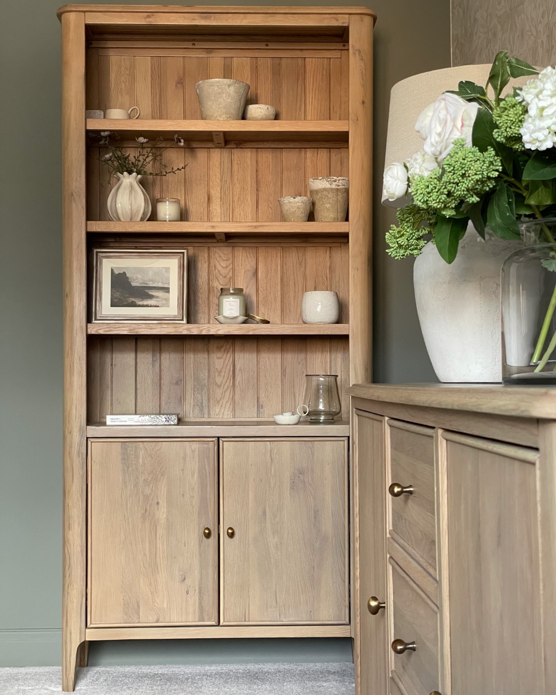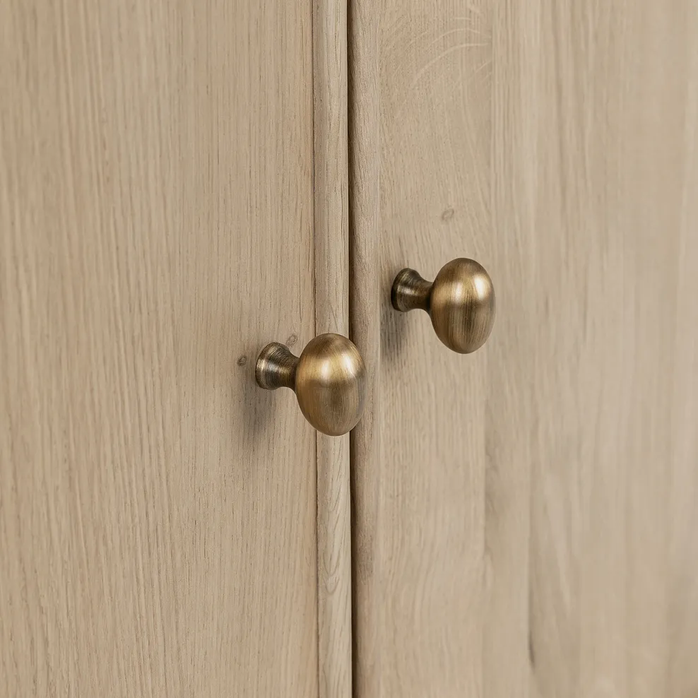 The bookcase features three generous adjustable shelves so you can fit an array of different-sized books, along with decorative objects to showcase your style. The lower large cupboard is finished with oval brass-coloured handles and offers handy hidden storage for all your bits and bobs.
