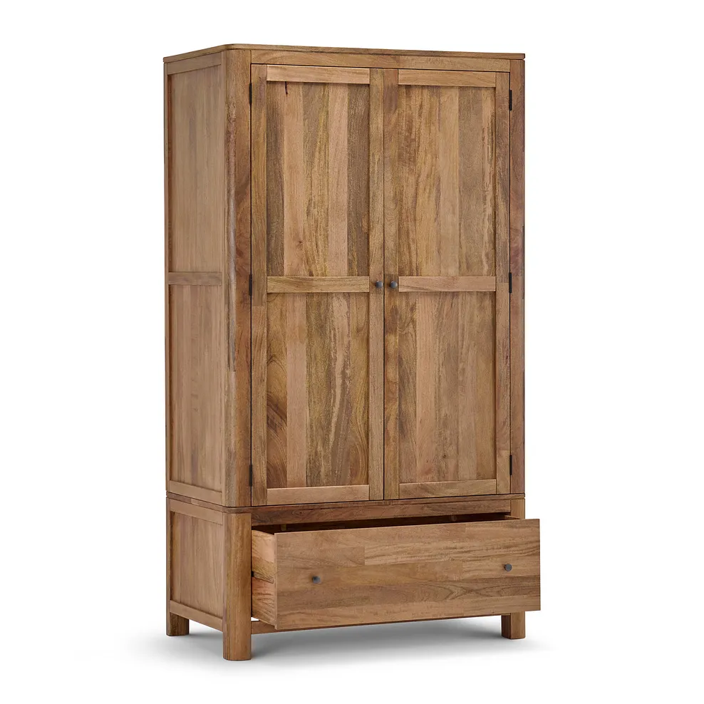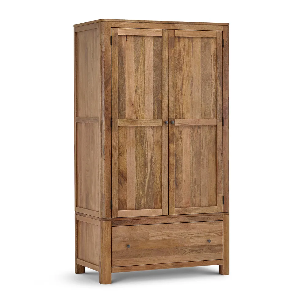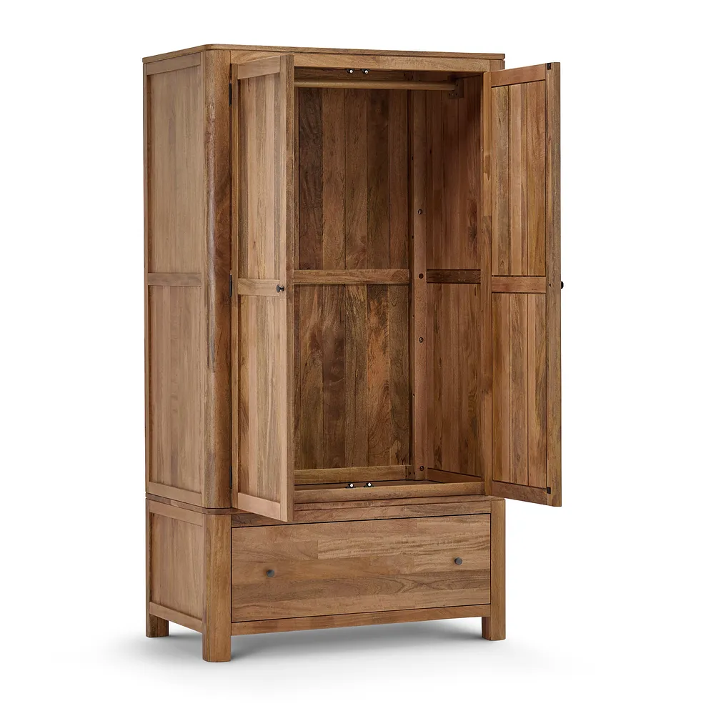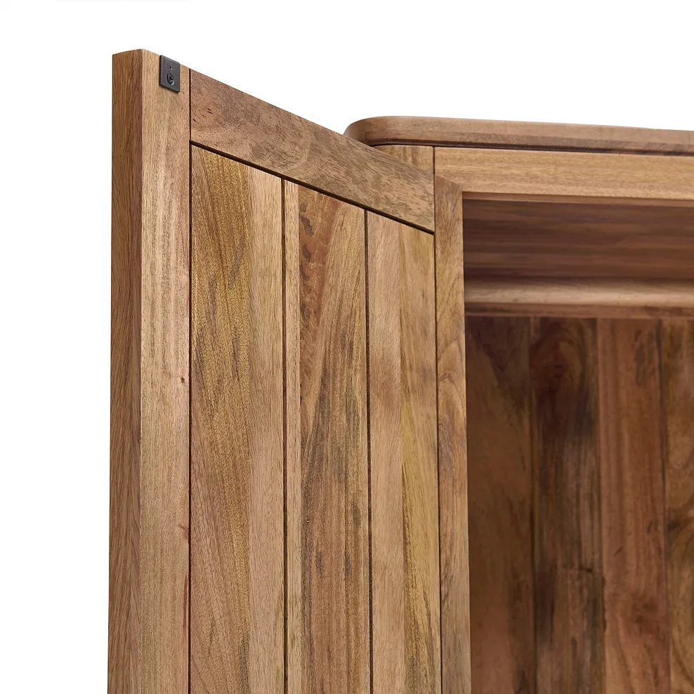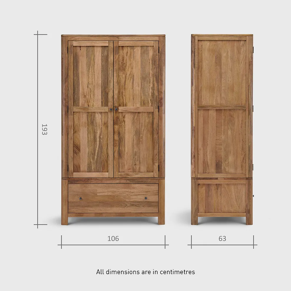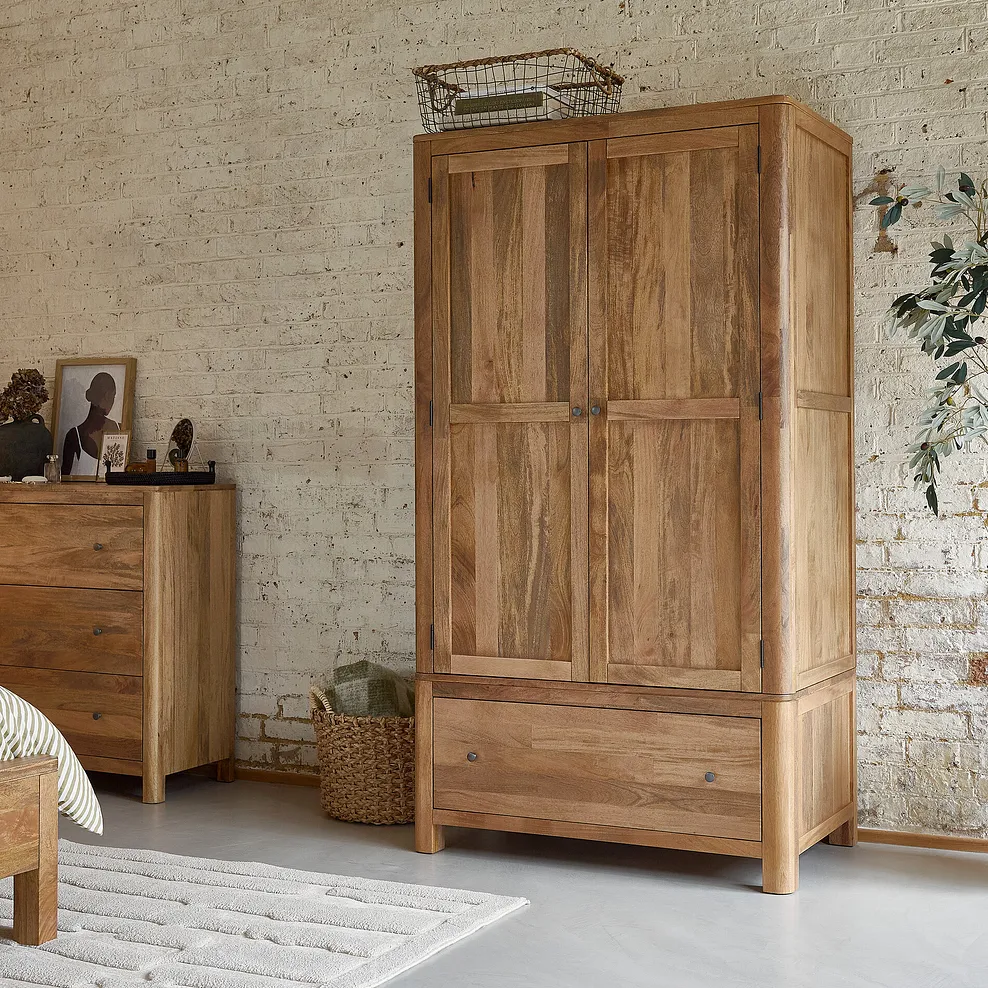 Add a touch of style to your bedroom organisation with our Noah double wardrobe, a beautifully crafted storage solution made from solid mango wood. Inside, you’ll find a spacious hanging rail and a lower shelf, providing ample storage for clothes, shoes, and accessories while maintaining a sleek, clutter-free space.
