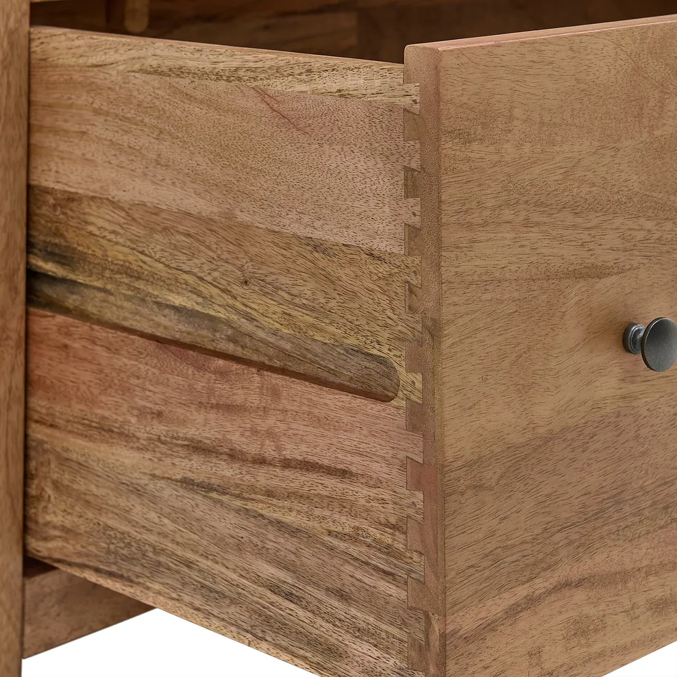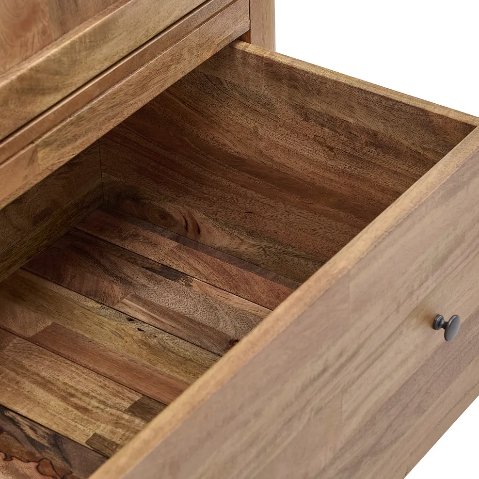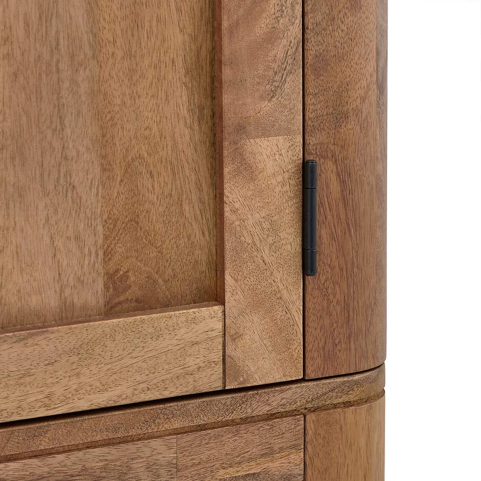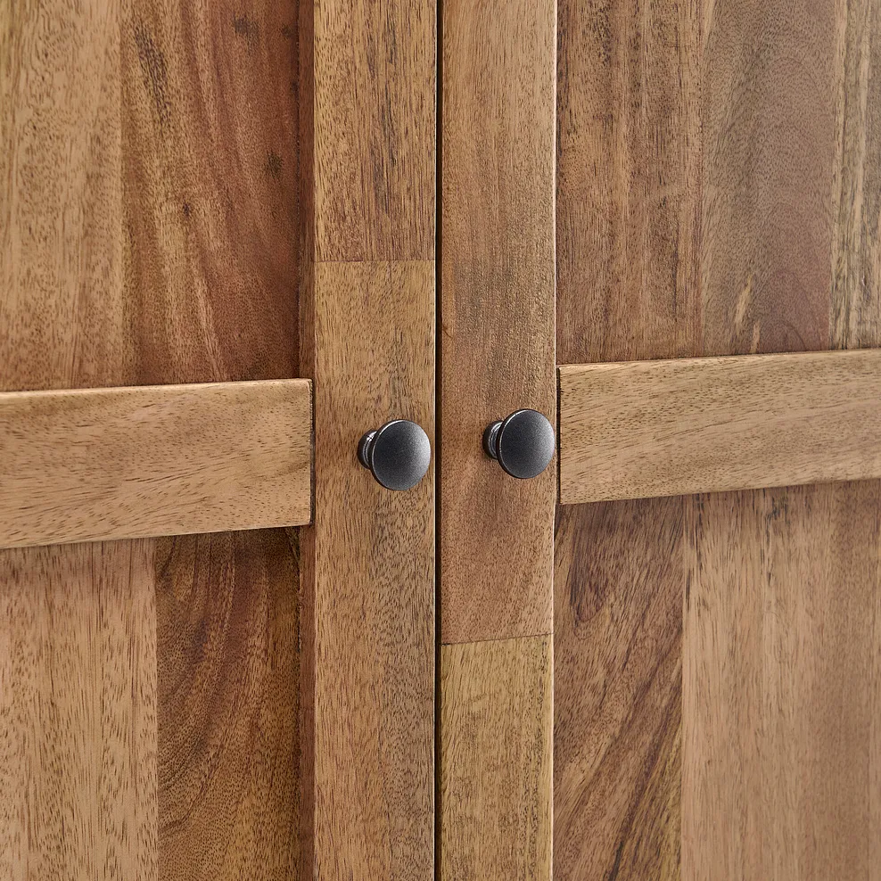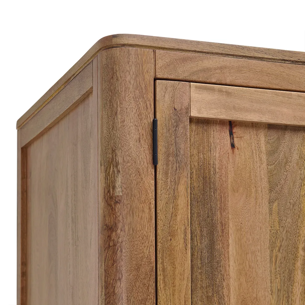 Gunmetal grey round handles add a touch of sleek modernity to the warm, inviting tones of the mango wood, while the soft close hinges and discreet magnet catches add effortless function. Its smooth matt finish enhances the natural colour variations synonymous with mango wood and the short lamination lines accentuate the natural grain.