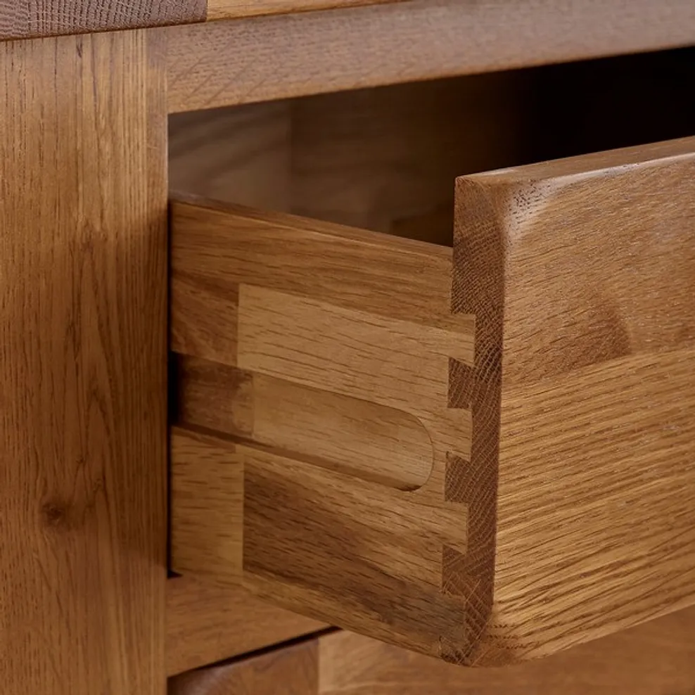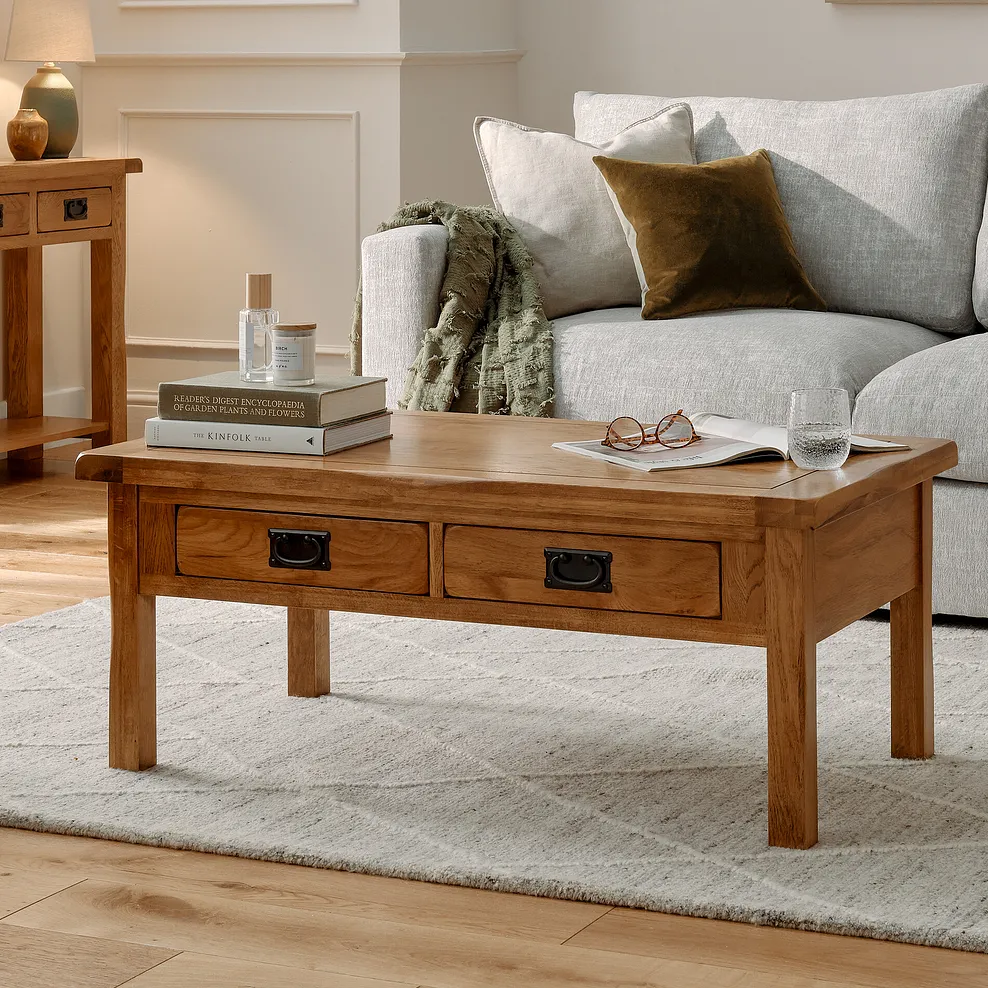 This Rustic Coffee Table features a traditional farmhouse styling with ample storage space. Made from the finest cuts of solid oak, it displays an enviable array of design features including softly rounded corners, chamfered edges and tongue and groove corner joints. What sets this coffee table apart is the added double-sided storage comprising four sturdy, built in drawers. Each drawer in this rustic coffee table is solidly designed using robust dovetail joints with solid oak backs, bases and runners. All these features create a piece of rustic furniture that is built to look like an antique, but with exceptional strength and longevity. Finishing touches include bronze tinted metal drop-bar handles and wax finish, which achieves a richer, aged glow to the wood grain.