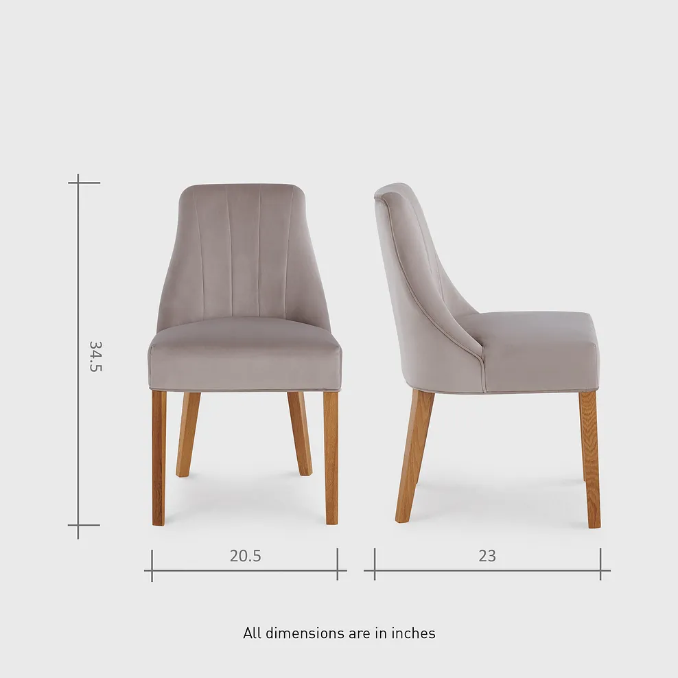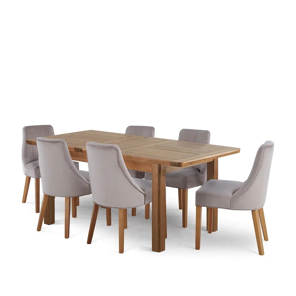 Create a timeless dining room look by combining our rustic Orrick 6-seater table with the Marlene velvet chairs. Upholstered in hard-wearing polyester velvet in mink, the chairs complement the warm finish of the solid oak Orrick and add a luxurious touch to your dining set. The extendable table features rounded edges and solid legs to give your home a classic feel that brings together modern and traditional design elements. Marlene chairs are also available in midnight and can be selected using our dining set builder.