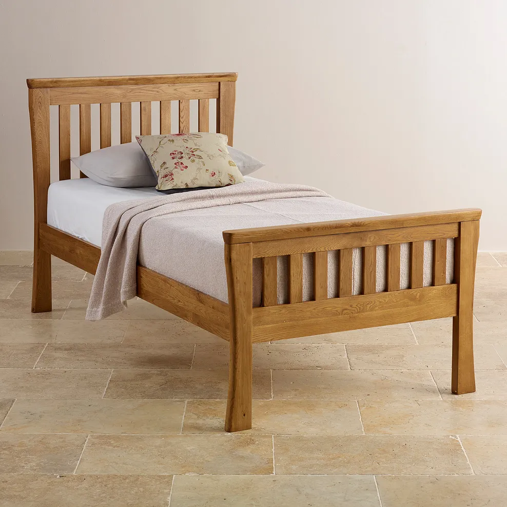 The Orrick Rustic Solid Oak Single Bed is a delightful option for a child’s or guest bedroom. Made from premium grade solid oak it features a traditional slatted design enhanced with a handcrafted, rustic styling. For a wonderfully sculpted effect, the legs are chamfered by hand and the corners softly rounded. The natural beauty of the solid oak is encouraged to take centre stage; finished only with a nourishing layer of our specially-formulated clear wax polish. If you choose to invest in this effortlessly stylish single bed, don’t forget we also sell a huge range of quality mattresses for the ultimate pairing of style and comfort. Also, why not check out the rest of the Orrick Rustic Solid Oak range to discover matching pieces for every room in the home?