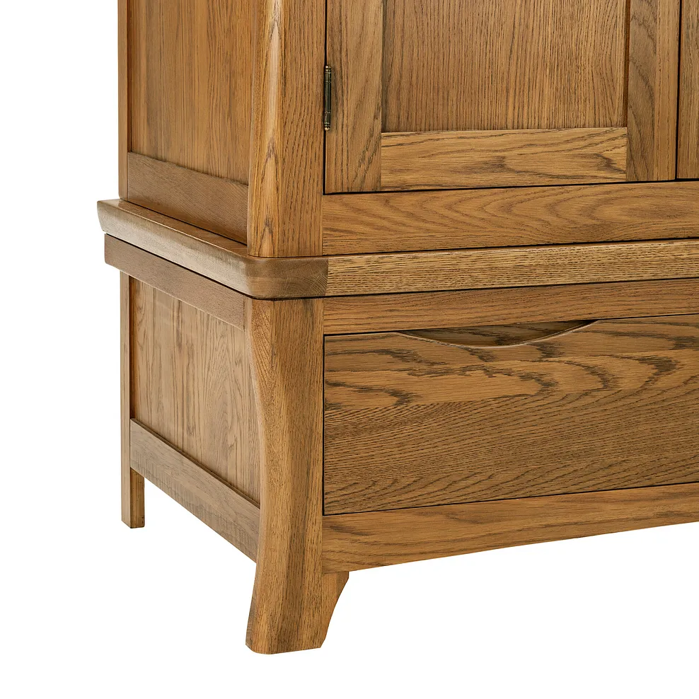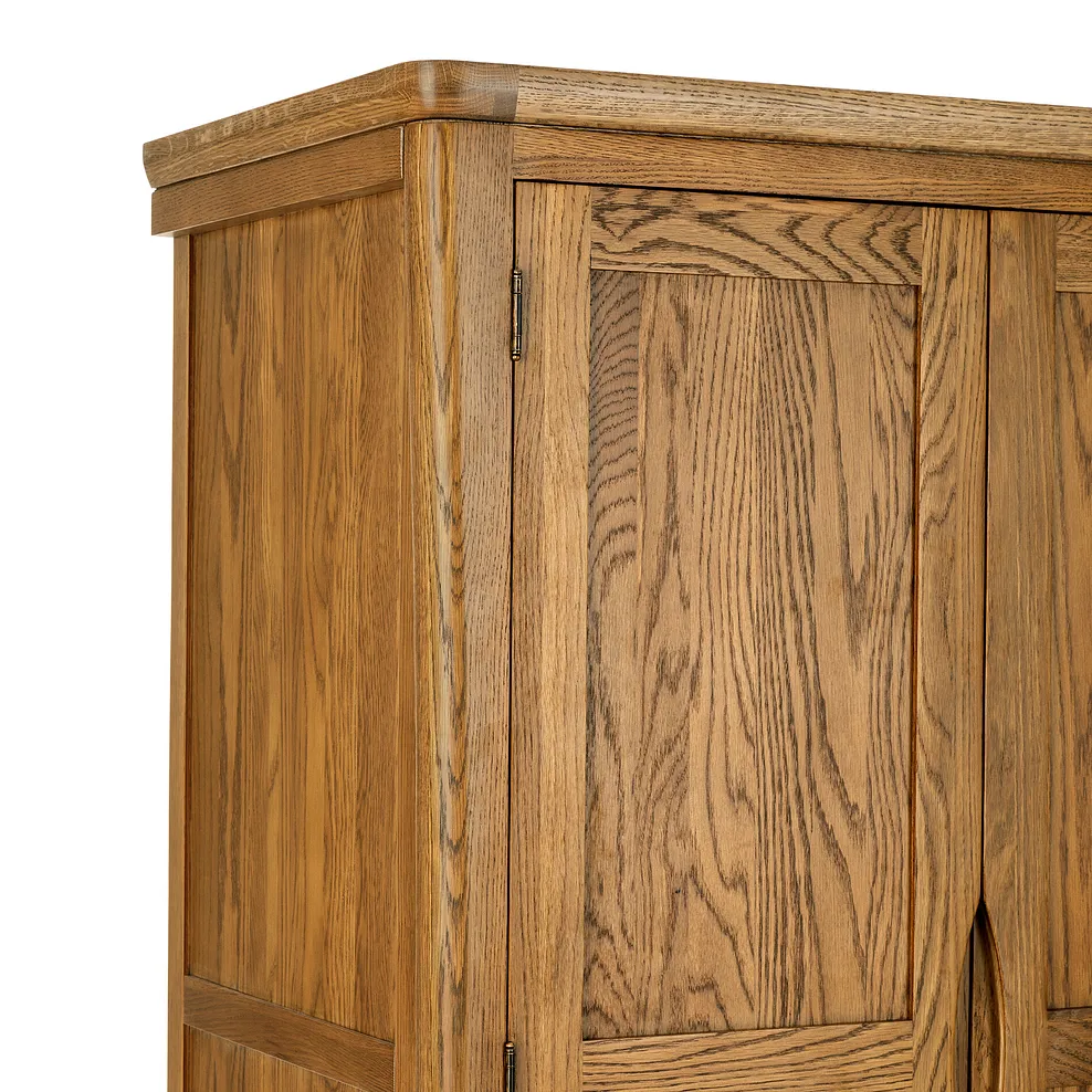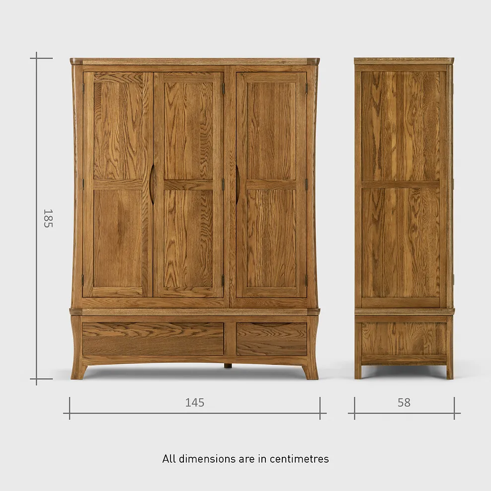 The Orrick Rustic Solid Oak Triple Wardrobe is a bold, distinctive piece which will add a sense of rustic charm to any bedroom. Designed to be the ultimate clothing storage solution, it features masses of hanging space within two cupboard areas and plentiful supplementary storage in two drawers. Generously-sized and made from one hundred percent oak throughout, these drawers boast traditional dovetail joints for exceptional strength and durability. Forming part of our highly sought-after Orrick Rustic range, the wardrobe flaunts an enviable array of design features including: hand chamfered edges, skilfully sculpted handles and rounded corners. For more rustically styled storage options, make sure you check of the rest of the Orrick Rustic collection.