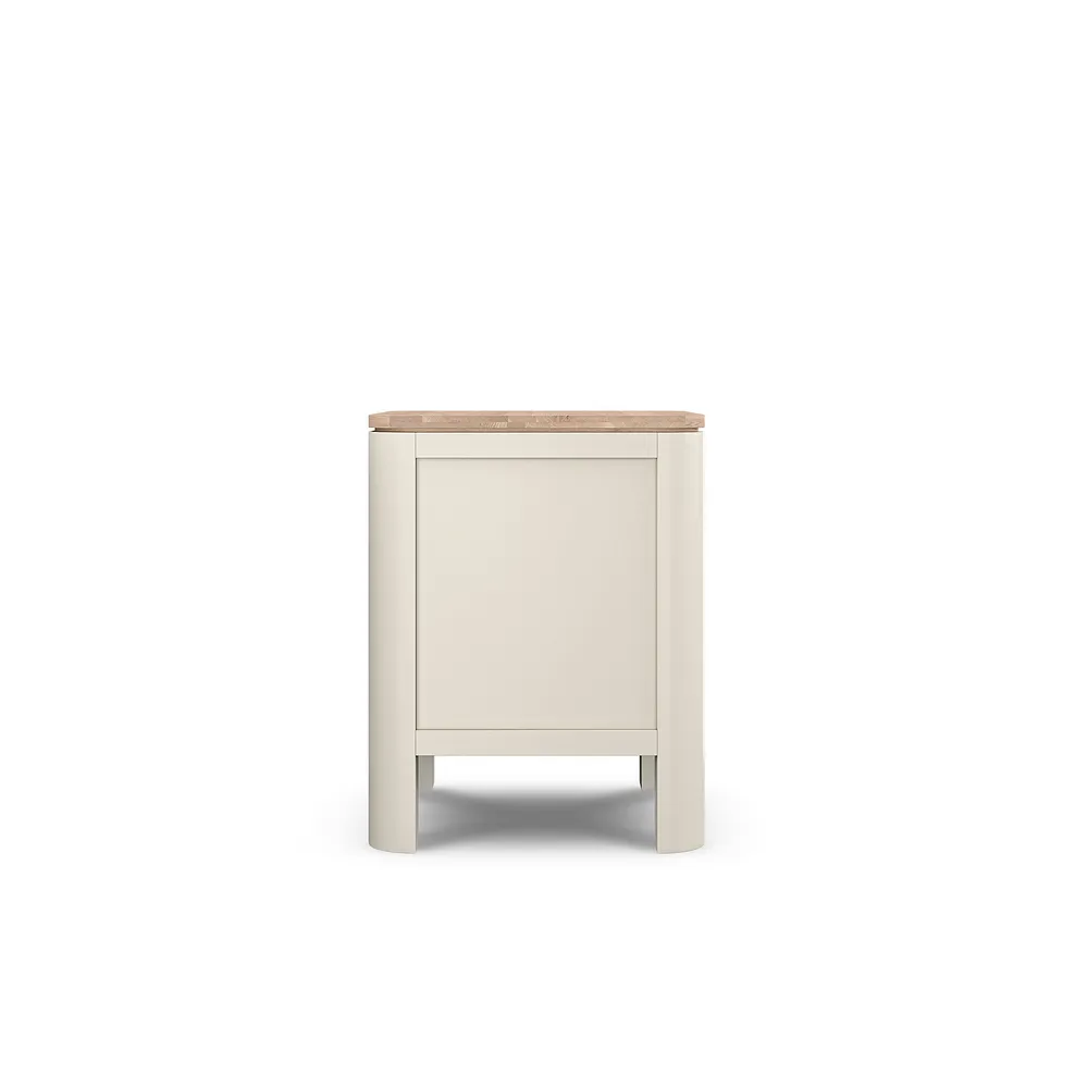 The smoked oak top offers a pleasing contrast and is the perfect perch for water glasses and books. Thoughtful gently curved edges and stepped-in handles add to its aesthetic appeal.