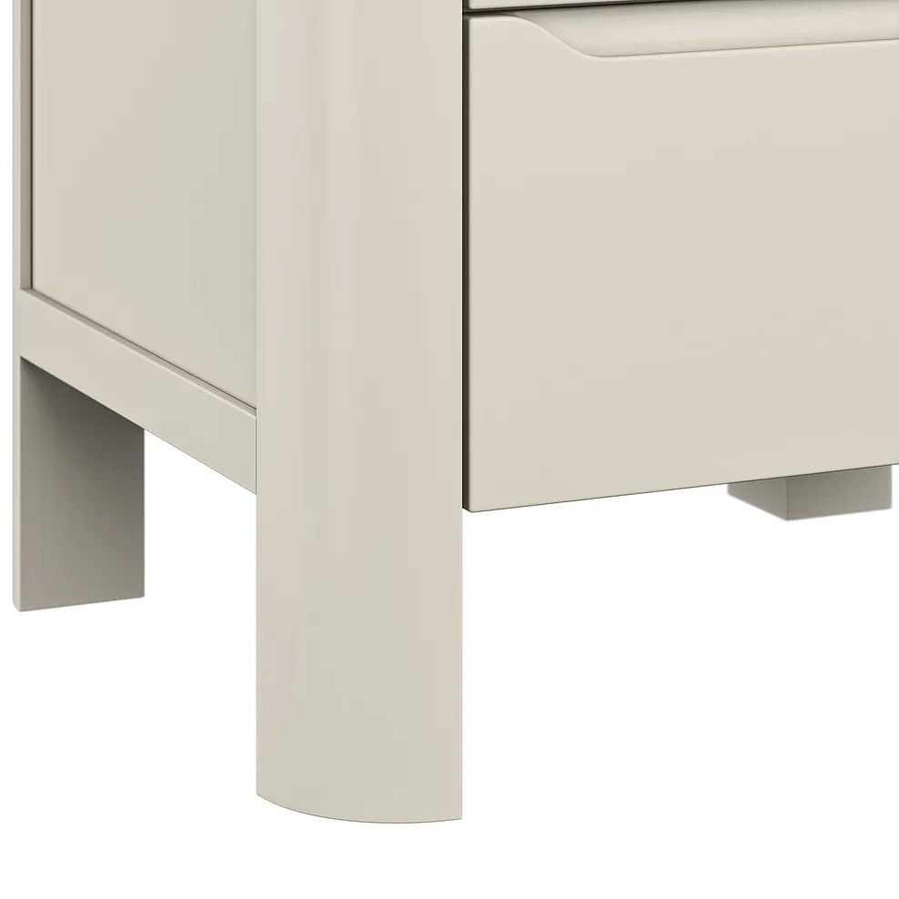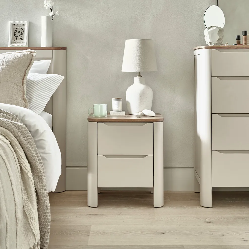 Treat your bedroom to the modern, stylish charm of our Otto 2-drawer bedside table. The compact design is made from solid acacia, painted in a neutral stone-inspired shade that blends easily with every decor style.