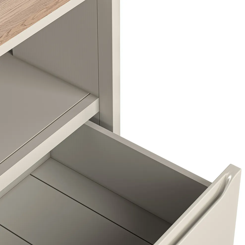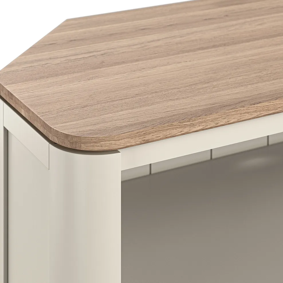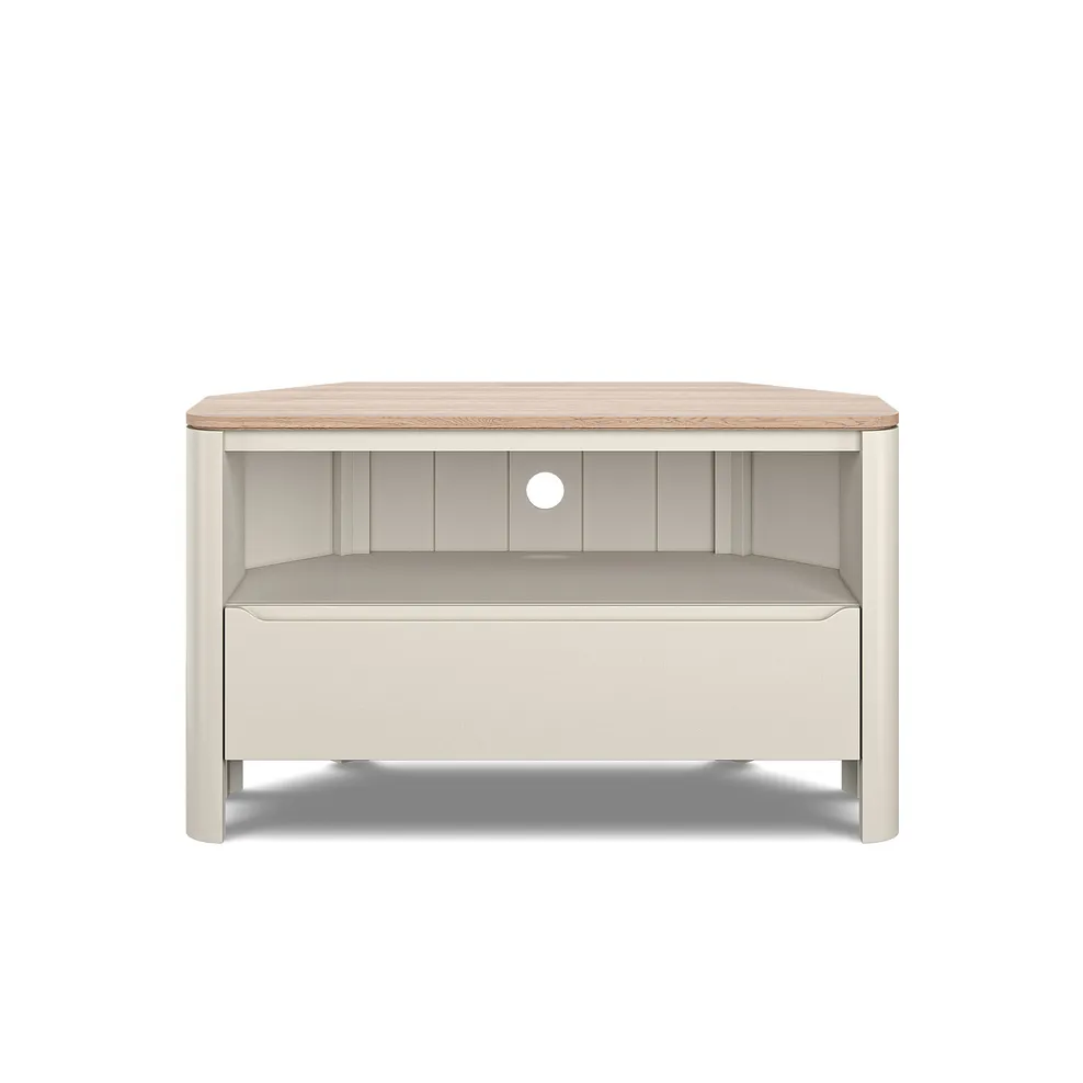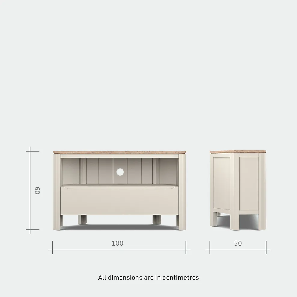 Create a space-saving entertainment nook with our Otto corner TV unit. Made from acacia painted in a neutral stone shade that’s beautifully contrasted with a smoked oak top, this unit adds sophisticated character to any modern living space. A robust drawer featuring hidden dovetail joints is the perfect place to store magazines and remotes, while a handy pre-drilled cable access point keeps wires out of sight.