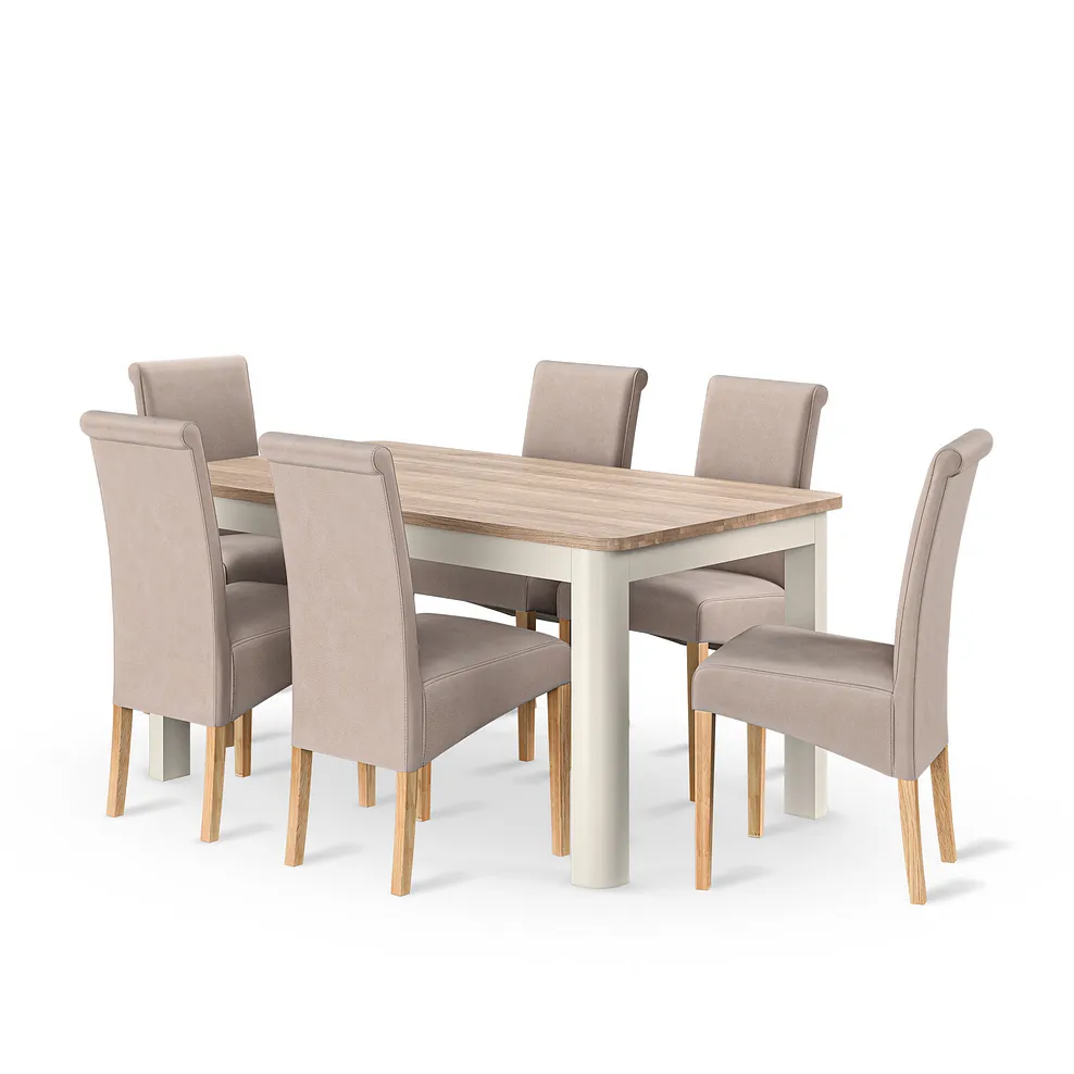 Make mealtimes flexible with our Otto 6-8-seater extendable dining table with 6 Scroll Back chairs in dappled beige fabric. These timeless chairs add a classic touch to the contemporary smoked oak table top to create a versatile look that brings comfort to home dining.