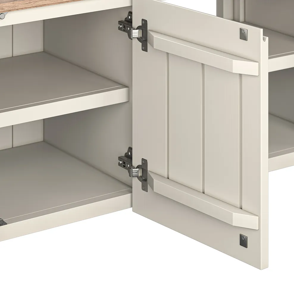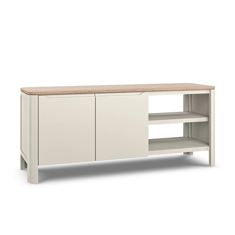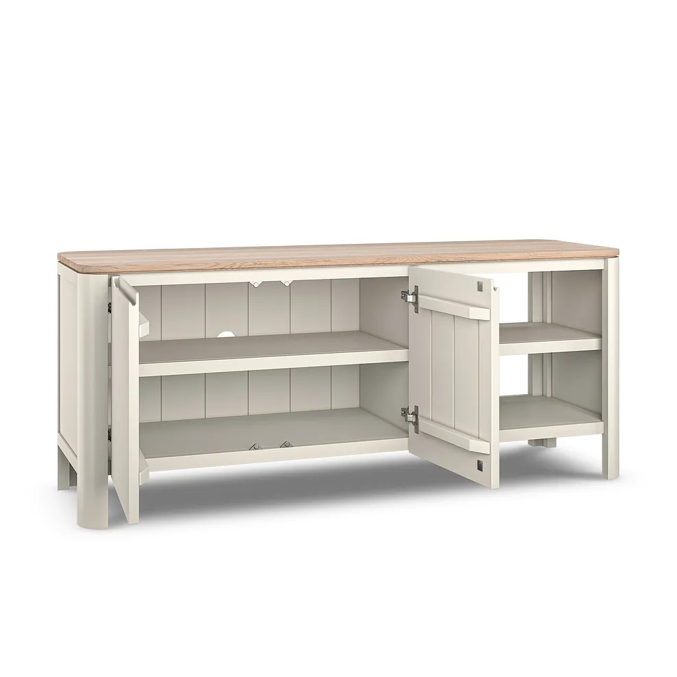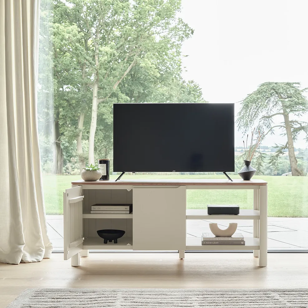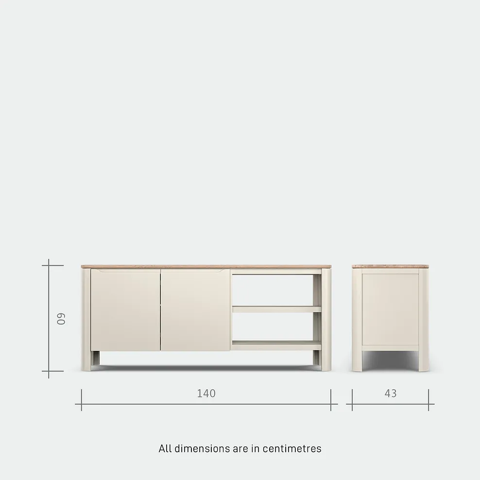 This exclusively designed unit seamlessly combines hidden traditional dovetail joints with contemporary soft-close doors and inviting curved edges. Keep your living room neat by hiding away TV remotes and more in the double-fronted cupboards. Shelving offers a handy home for digital boxes, while the pre-drilled hole at the back of the unit keeps your cables accessible but out of sight.