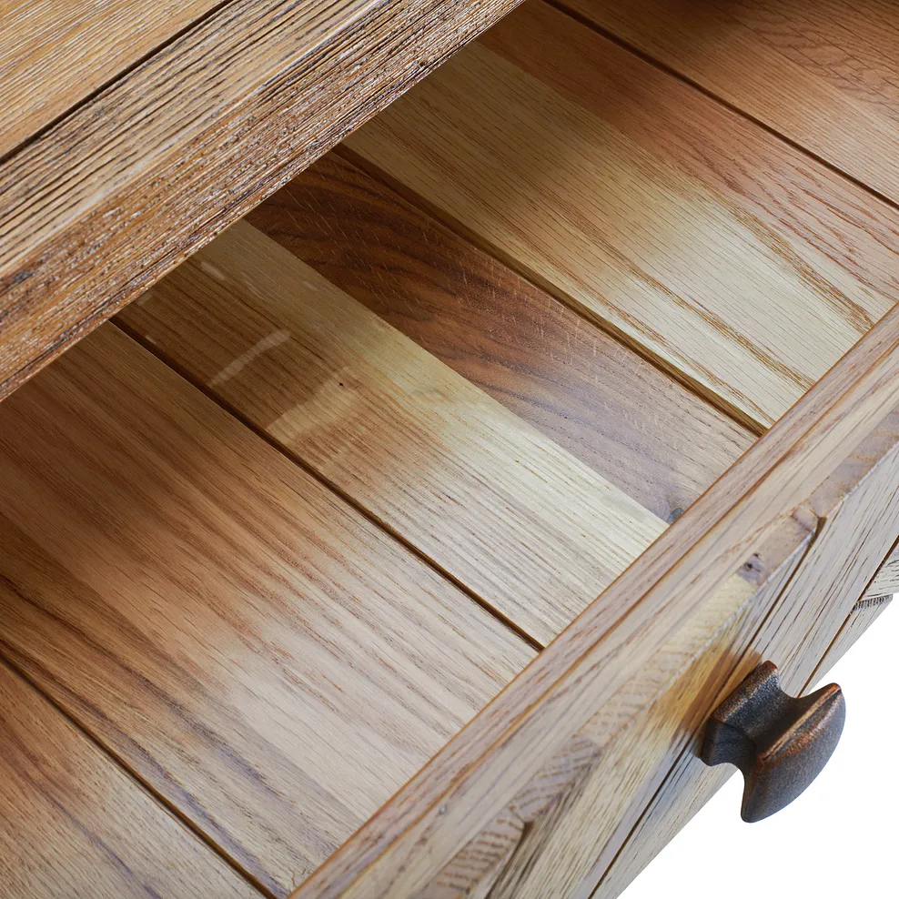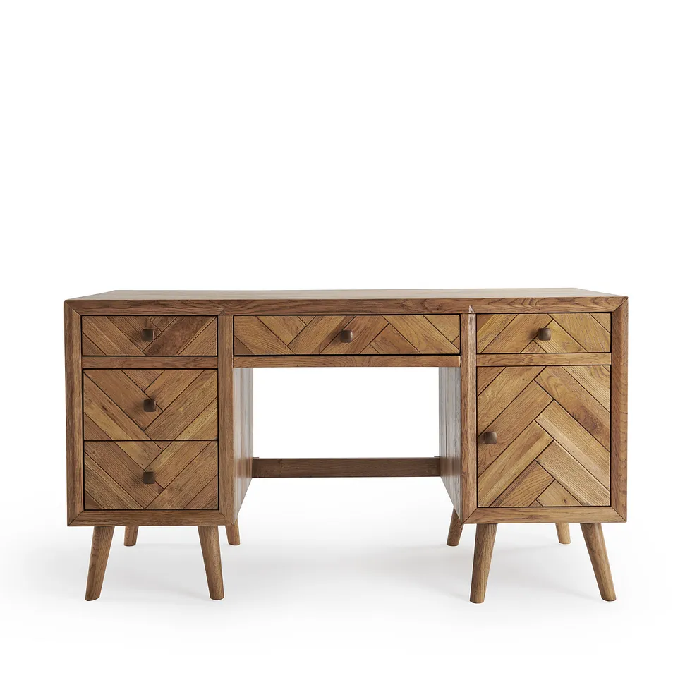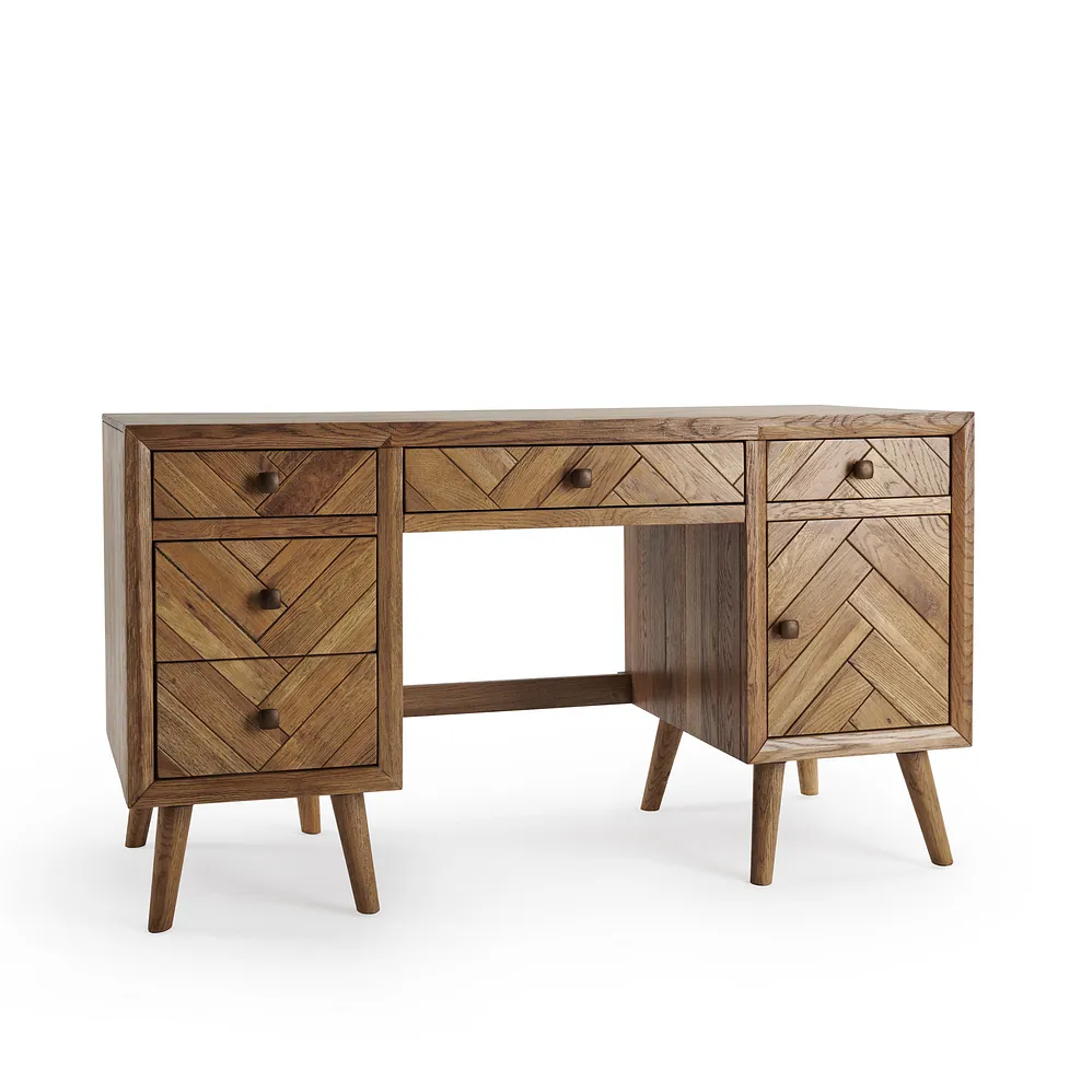 Our Parquet computer desk is decorative and strong. Made from solid oak, it features a wood block pattern on drawer and cupboard fronts. Classic carpentry features in the build, too, including dovetail joints on drawers. It has a textured brushed and glazed finish, and a mid-century modern look, with metal bronze coloured handles and slim oak legs. It’s a desk that’s properly made to look good, every day.