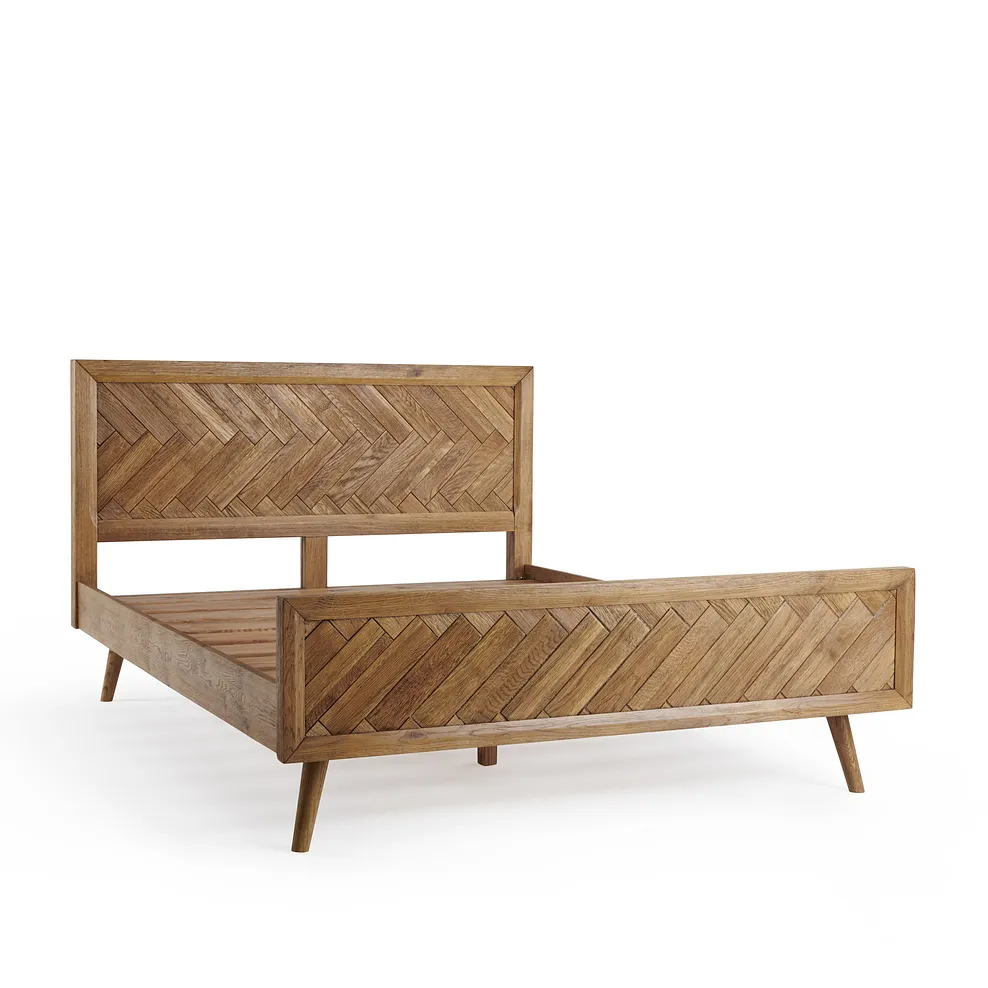 Our beds are always 100% solid hardwood, and the Parquet king-size bed is no exception. The head and footboards feature solid oak with a brushed and glazed finish, featuring decoration based on classic wood block design. Mid-century modern slim oak legs add to the design, and the supporting slats are also oak. We make furniture, with tried and tested carpentry, to last. Our mattresses are made with the same care.