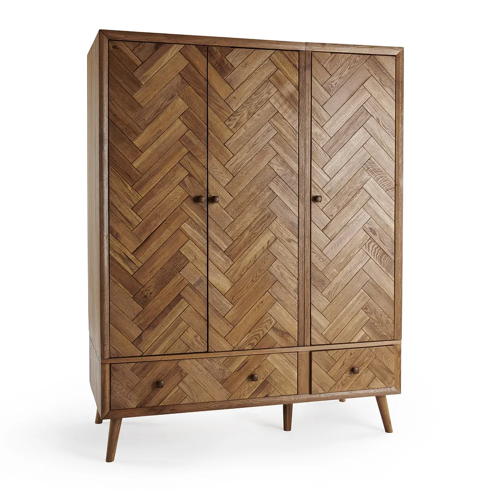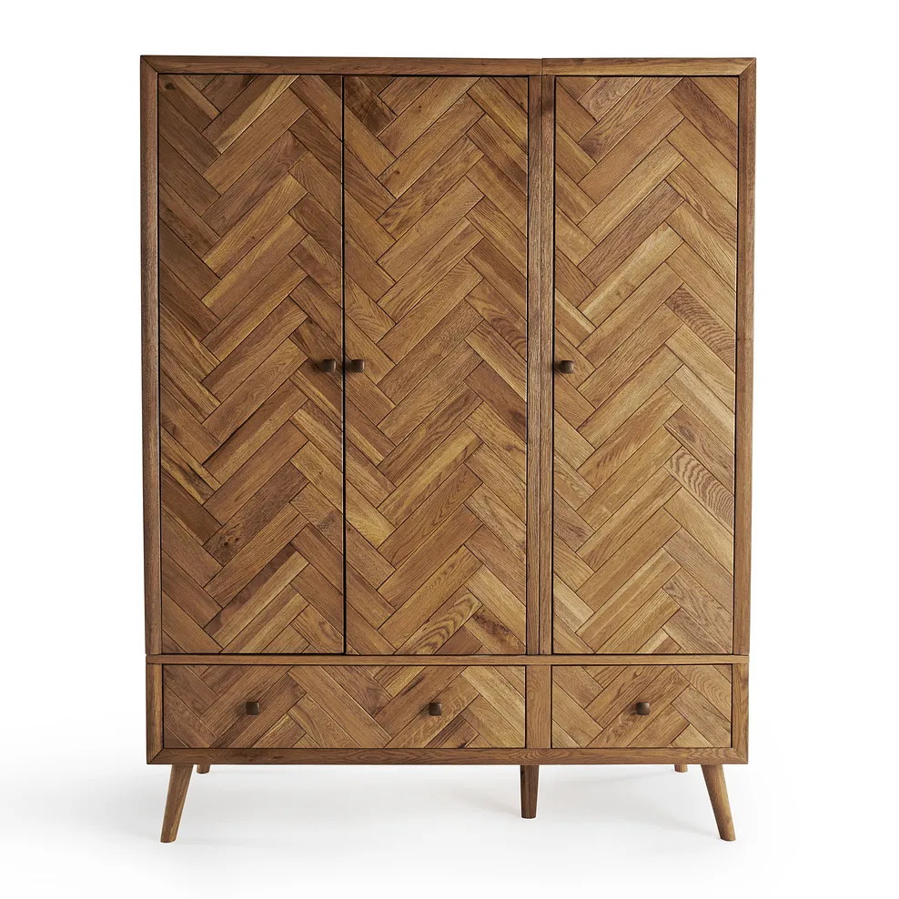 Great to look at and with a tactile finish, the Parquet triple wardrobe is made from solid oak. It features decorative panels based on classic wood block floor design, and mid-century modern style with slim oak legs and bronze coloured metal handles. Designed in-house, it has sturdy oak hanging rails and solid drawers with dovetail joints. A brushed and glazed finish tops off the style, made to look good €“ for life.