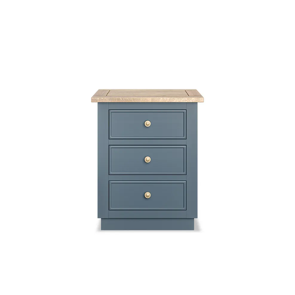 The three drawers feature brass-coloured hardware to create a timeless finish that contrasts beautifully with the dark blue.