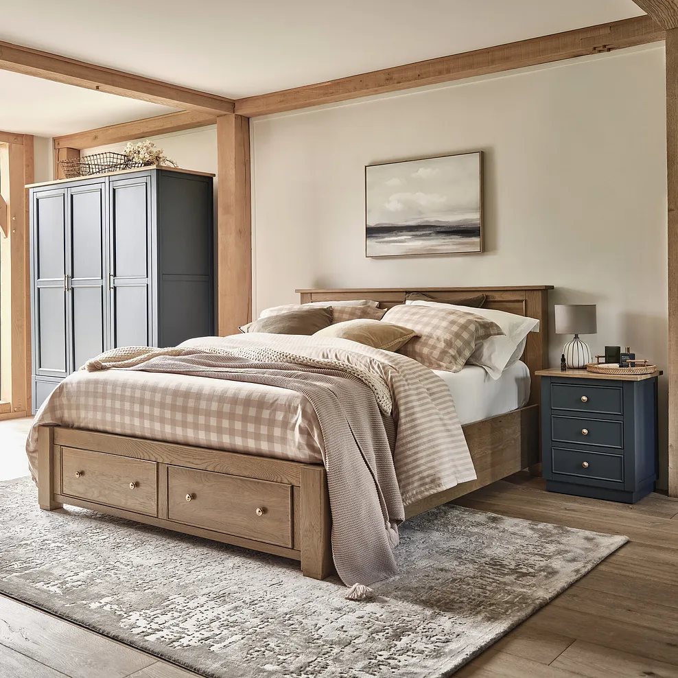 Transform your bedroom into an elegant space with our Richmond bedside table. The ink blue painted acacia and smoked finish oak unit offers handy storage and a home for that all-important bedside light.
