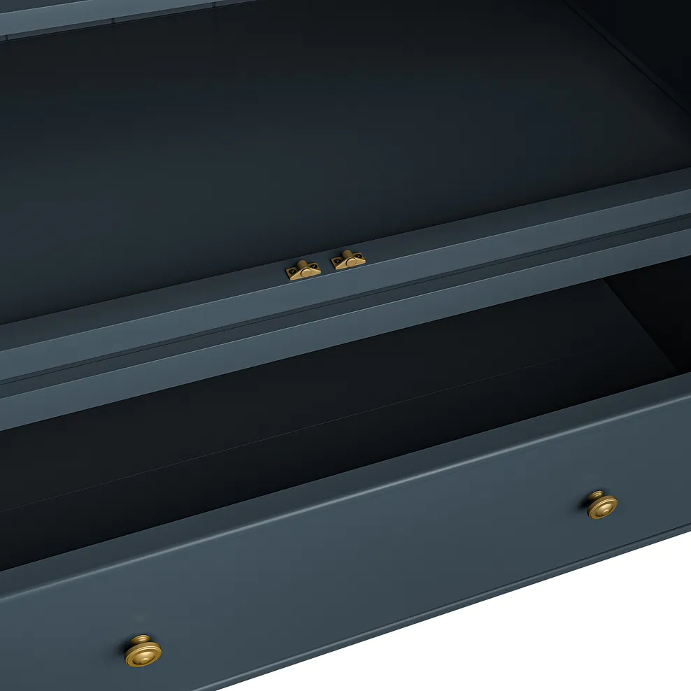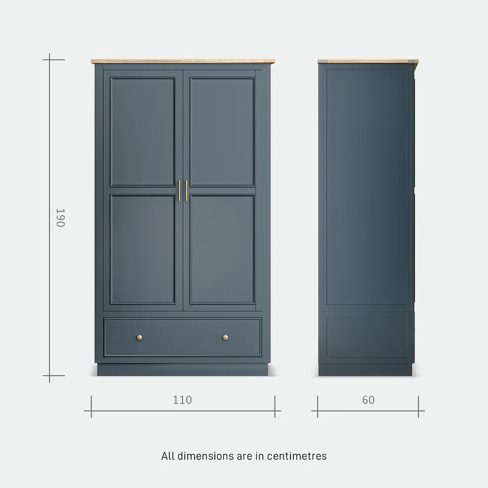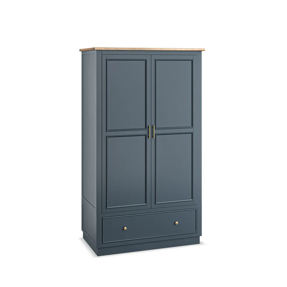 Bring style to your bedroom essentials with our Richmond double wardrobe. The acacia storage unit is painted in an ink blue shade to create a soothing backdrop to your sleep sanctuary, with brass-coloured hardware adding an elegant finishing touch to the panelled fronts. A smoked finish oak top complements the blue tones beautifully to bring farmhouse-inspired design to your home.