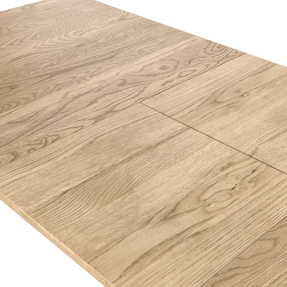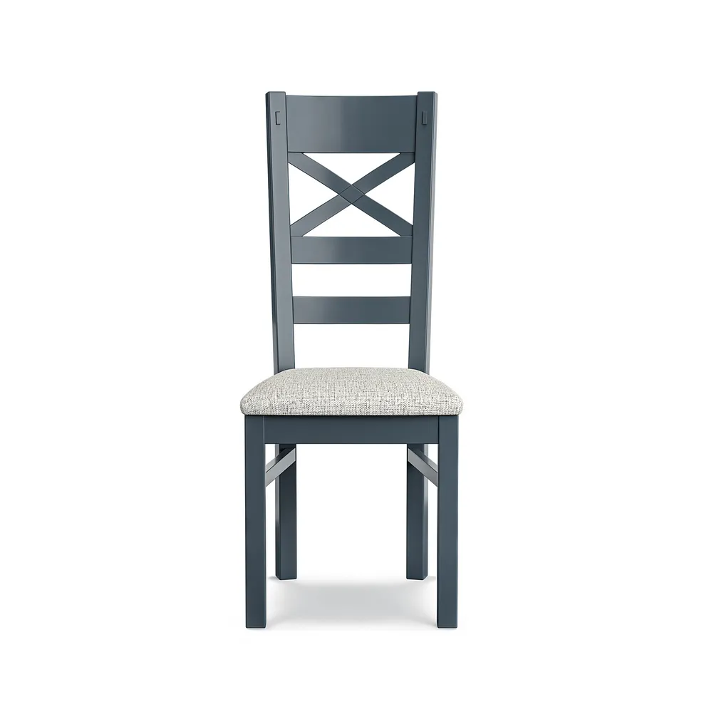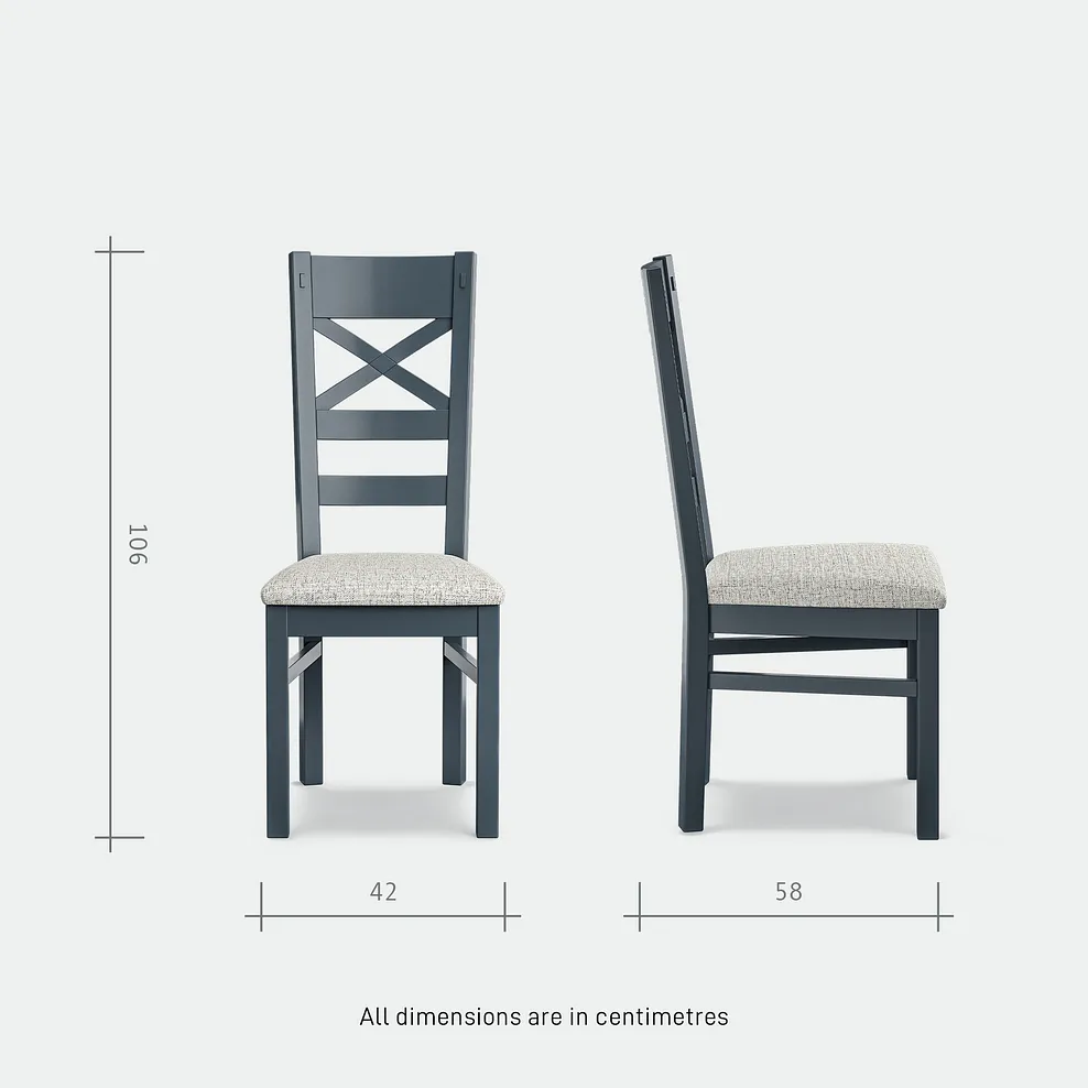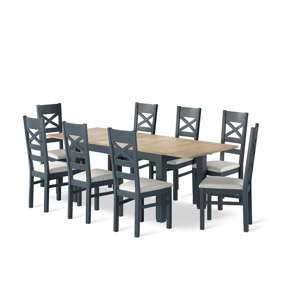 The extendable table offers generous space for both family meals and larger gatherings, making it perfect for entertaining. Paired with eight matching chairs, each with softly padded grey seats, the set delivers exceptional comfort without compromising on style. The neutral grey upholstery complements the painted finish, adding a calm, contemporary touch to the rustic design.