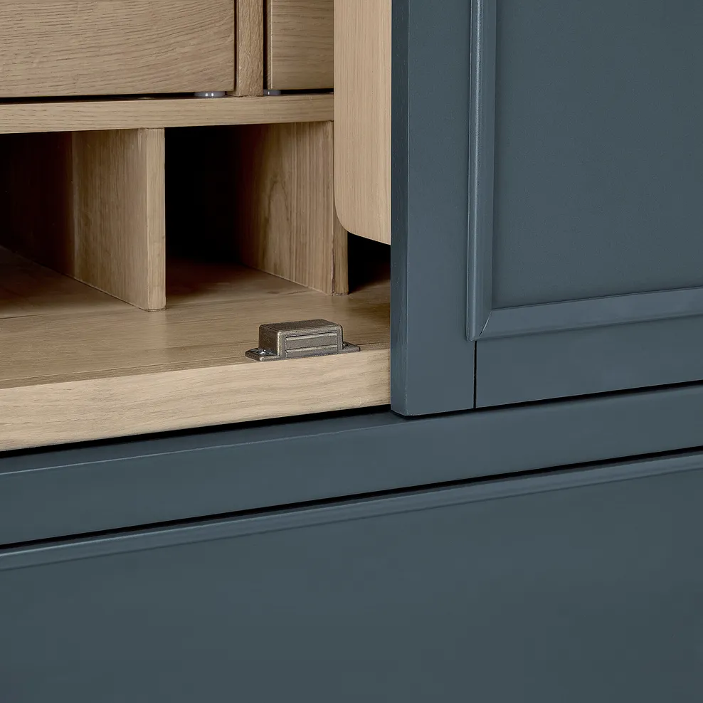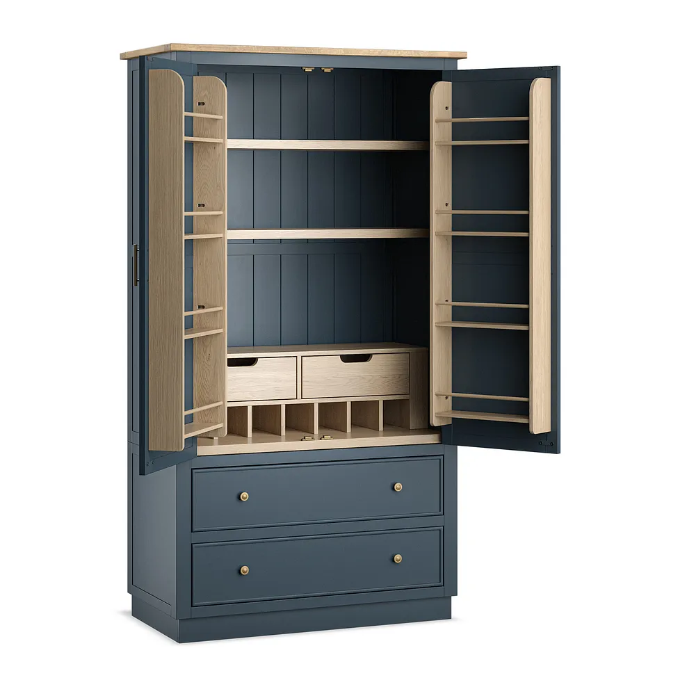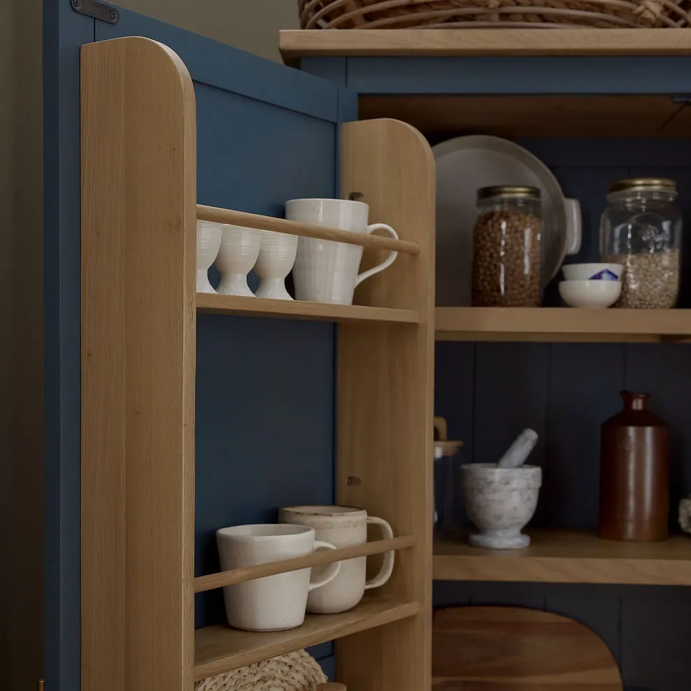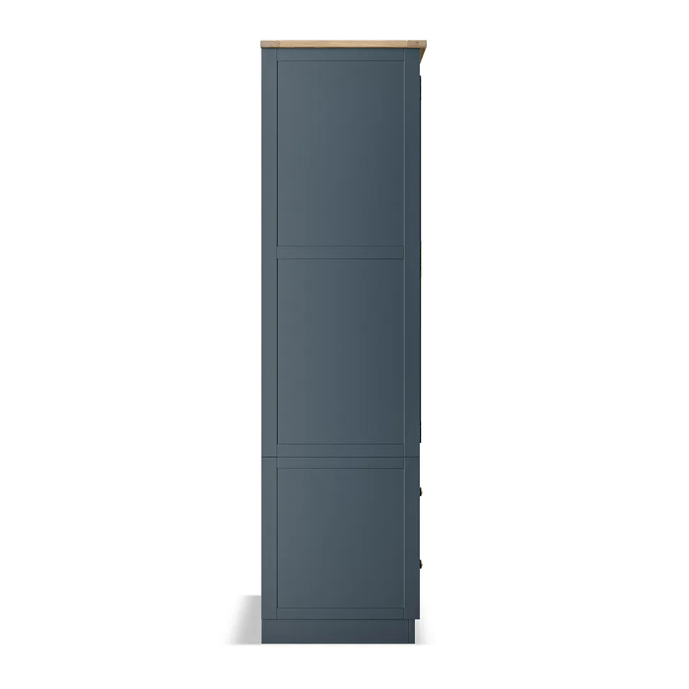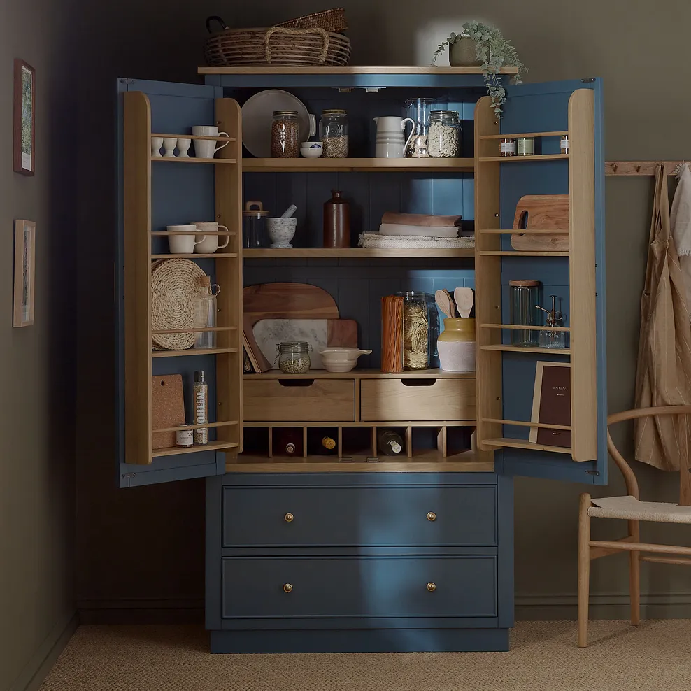 Finished in a rich, deep blue paint, the Richmond Large Larder is complemented by stunning solid oak internal detailing, making every opening feel like a special moment. The brass-coloured handles add a touch of timeless sophistication, while the two generous deep drawers provide plenty of space for larger items. A smoked finish oak top complements the blue tones beautifully to bring farmhouse-inspired design to your home.