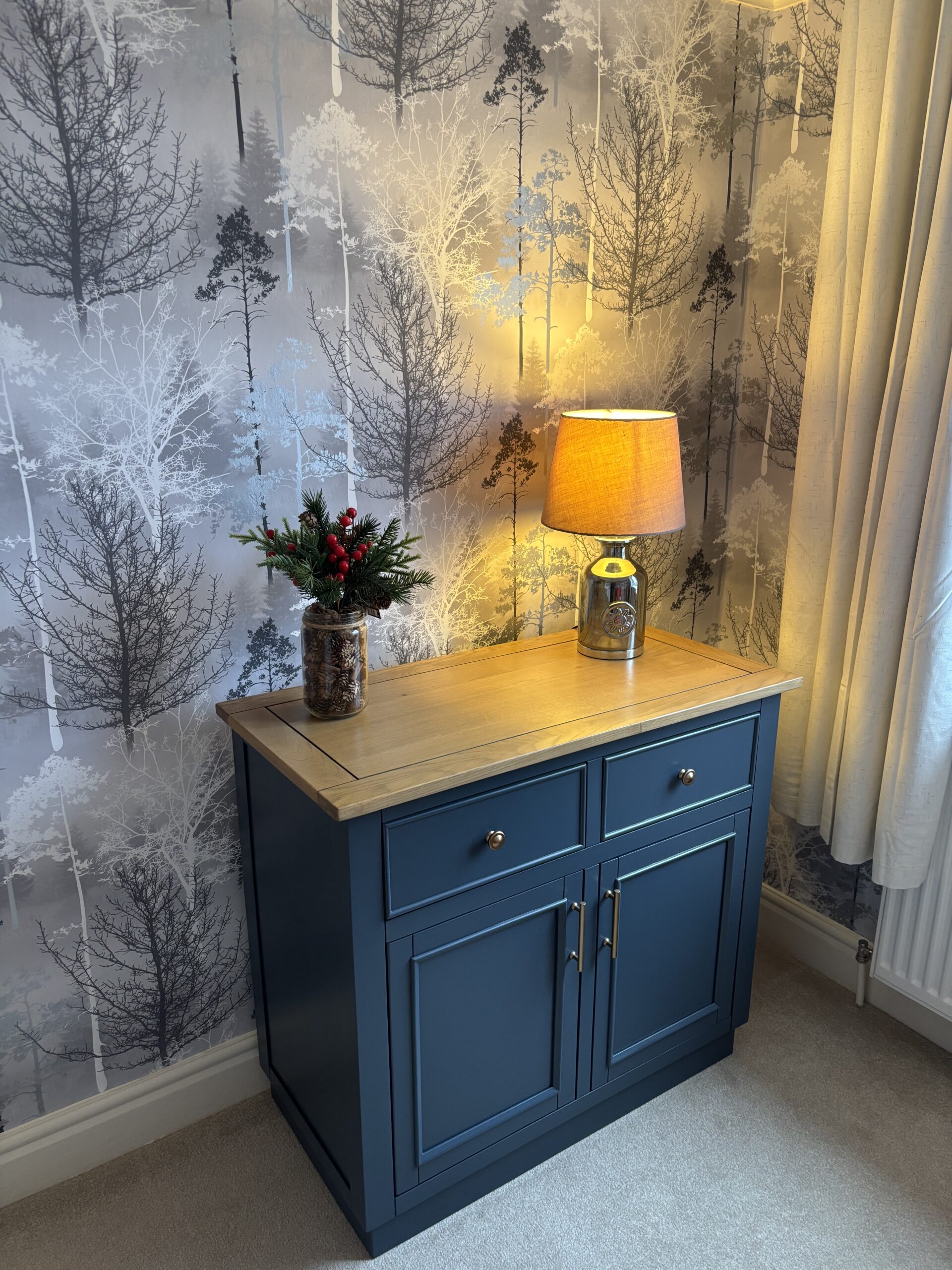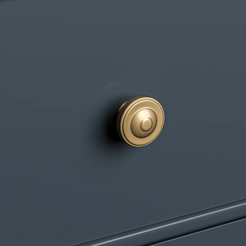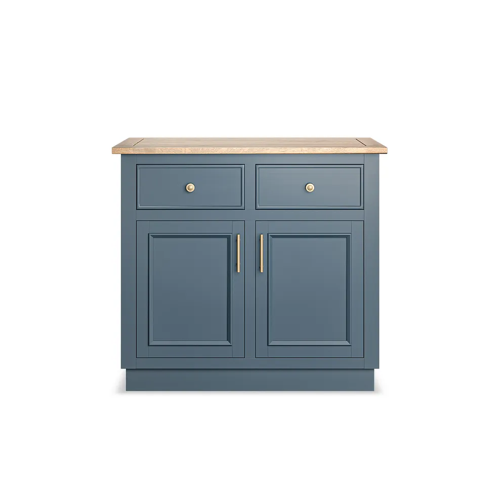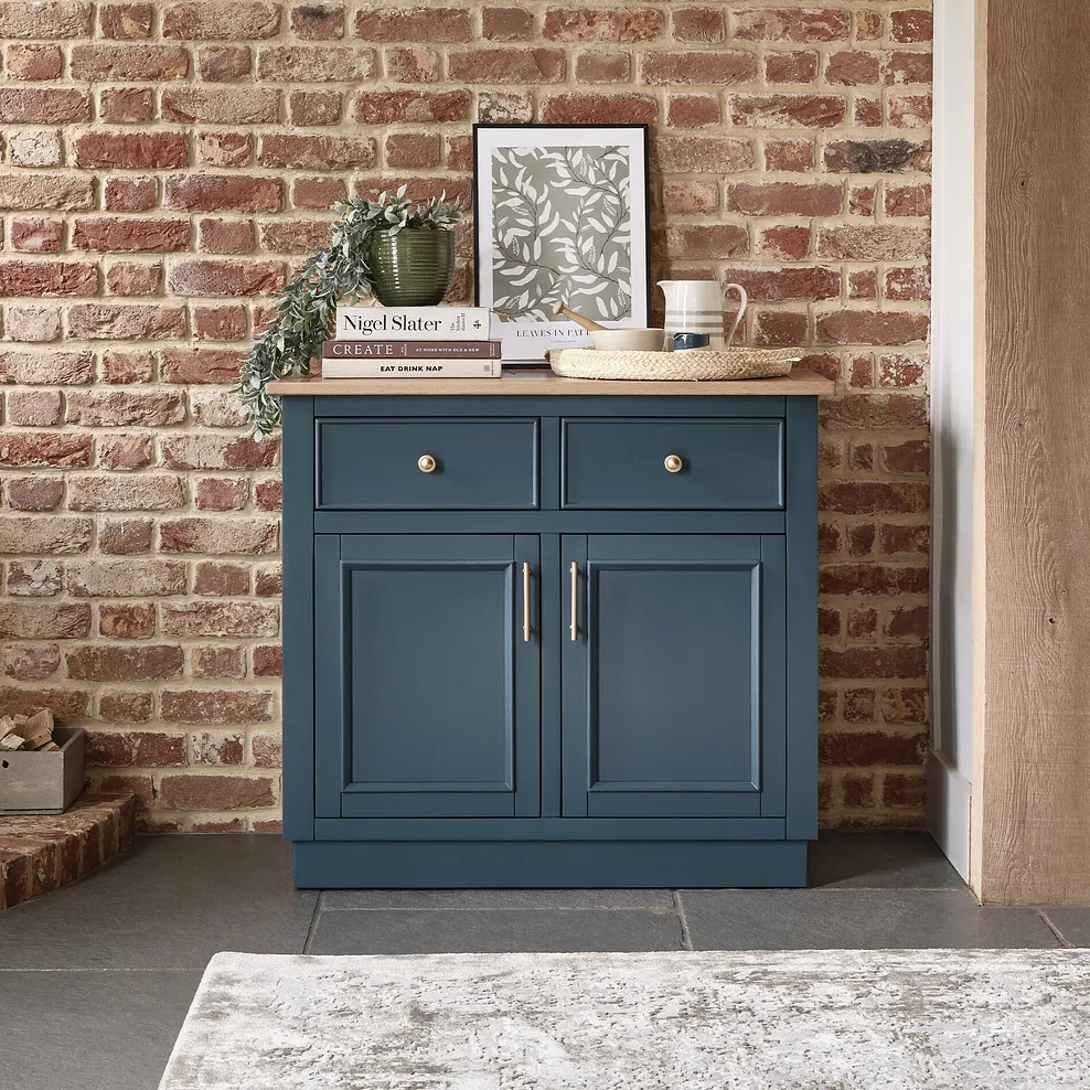 The oak and acacia unit combines compact proportions with timeless design, including Shaker-style panelling and brass-coloured hardware on the drawer and cupboard fronts. The ink blue painted finish brings a refined touch that matches beautifully with the smoked finish oak top.