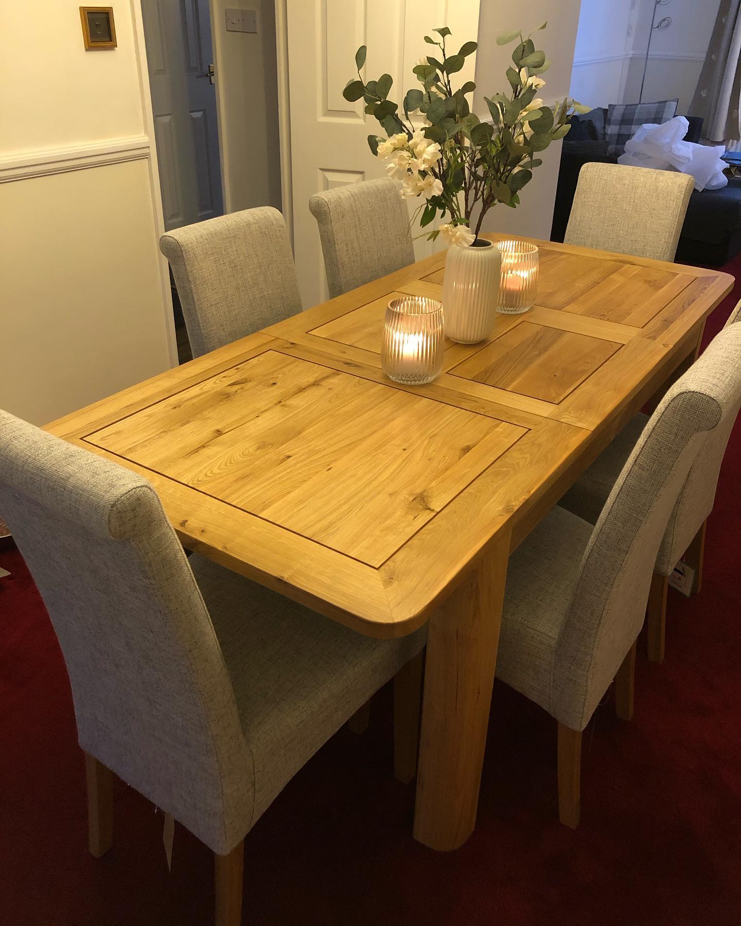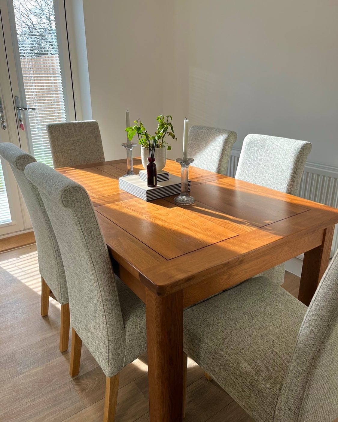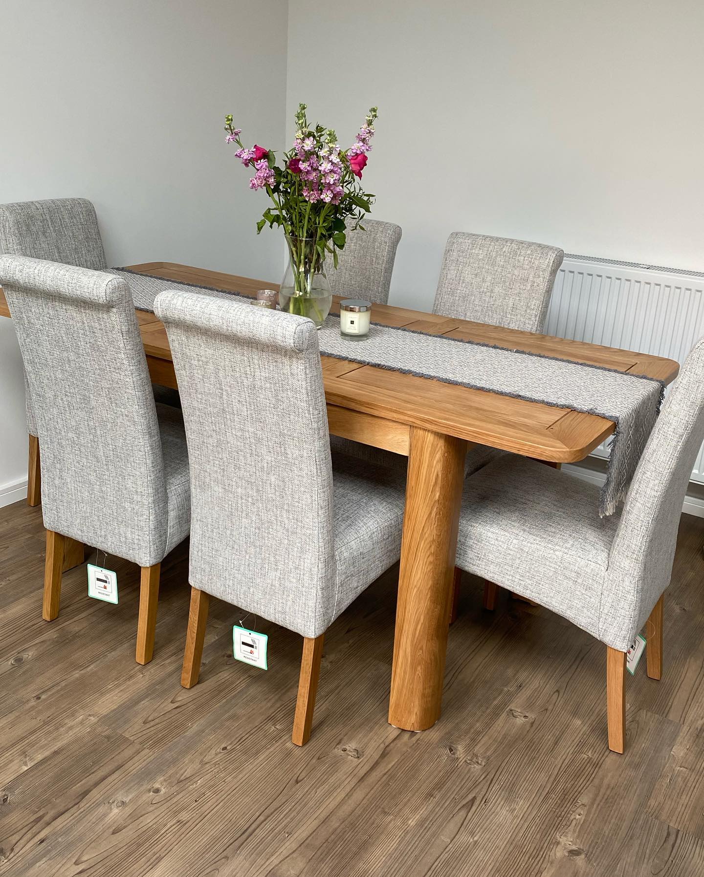 This dining set comprises the Romsey solid oak 4ft 3€/5ft 9€ extendable dining table and six scroll-back chairs in light grey, or six dining chairs of your choice when you use our Build Your Own Dining Set tool.
