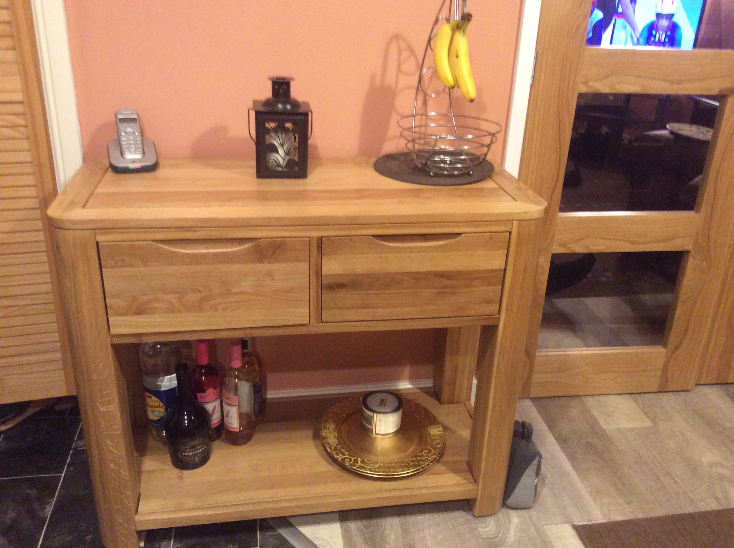 Our Romsey console table helps to add storage to your hallway, entryway, or living room. It’s made from 100% solid oak for strength and durability, and features two drawers with oak bases, backs, and runners, and real dovetail joints that will stand the test of time. The console table fits easily into modern home decor, with a simple shape, and warm cheerful tones from the natural protective finish. The low storage shelf provides a storage and display area, and the top boasts cut detailing to complete the look. All of the signature design hallmarks of the Romsey range are present in this piece, including the gently rounded corners, flat-fronted drawers, and sculpted, recessed handles. Shop the full Romsey range to find more matching looks for your home.