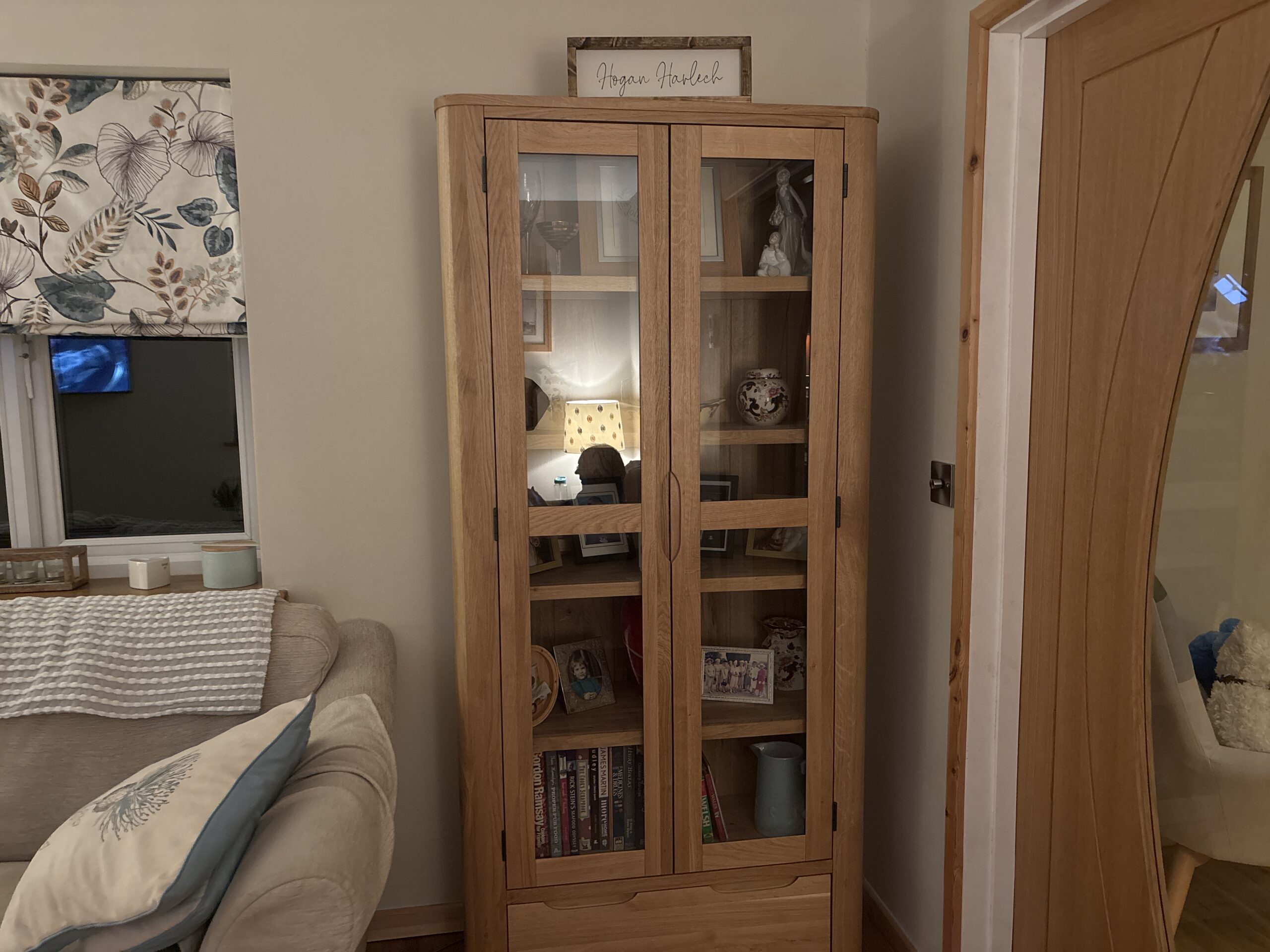 Protect and showcase your favourite keepsakes with our stylish Romsey display cabinet. This stunning unit has glass-fronted doors which enclose sturdy solid oak shelves, creating a perfect space to safely store your belongings. It also features a low storage drawer, perfect for hidden storage. Completed with real dovetail joints and solid oak bases, backs, and runners, it won’t bend or bow over time. Romsey is constructed from solid oak in our gorgeous natural finish, which helps to nourish and protect the wood and give it a subtle sheen. The display cabinet is completed with the cheerful design hallmarks of the Romsey range, including rounded corners, flat-fronted drawers, and carved handles. It’s a perfect addition to modern family homes!