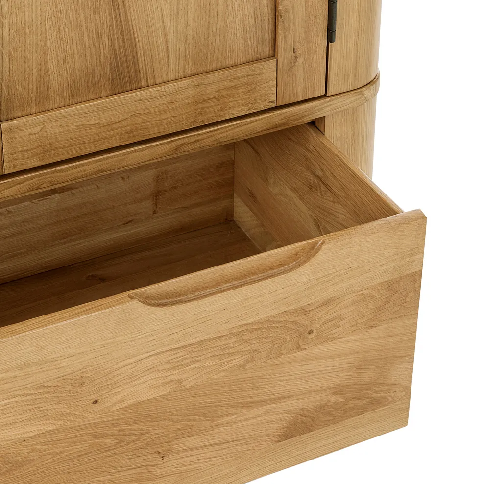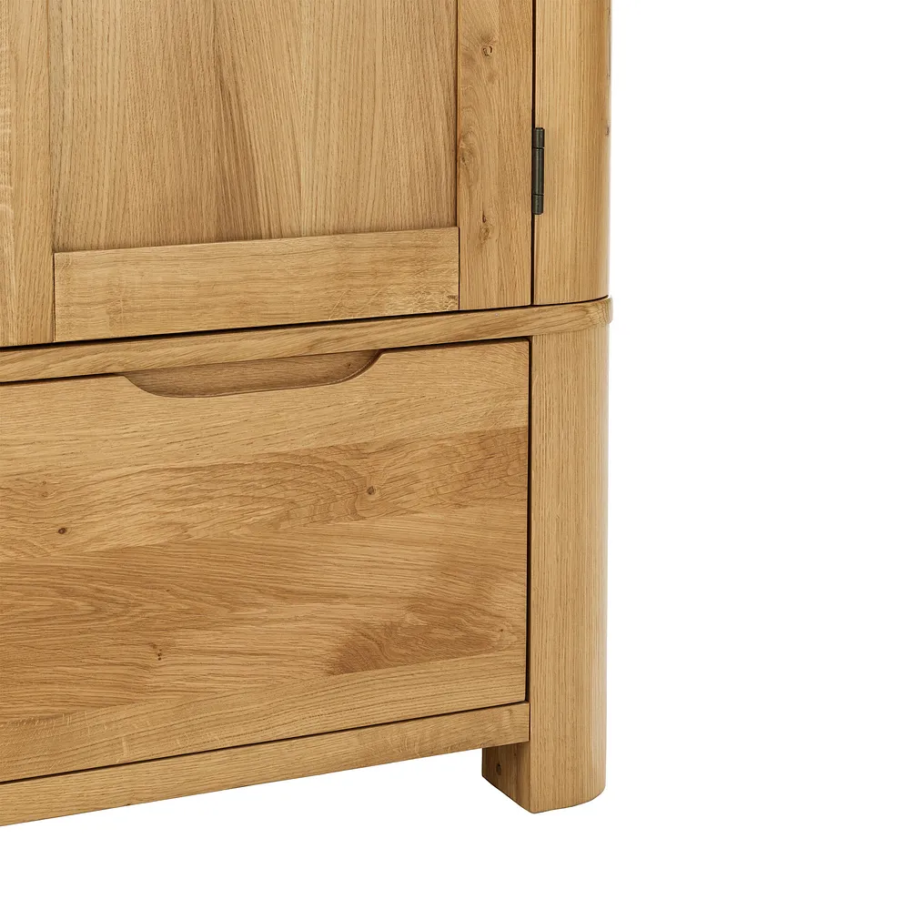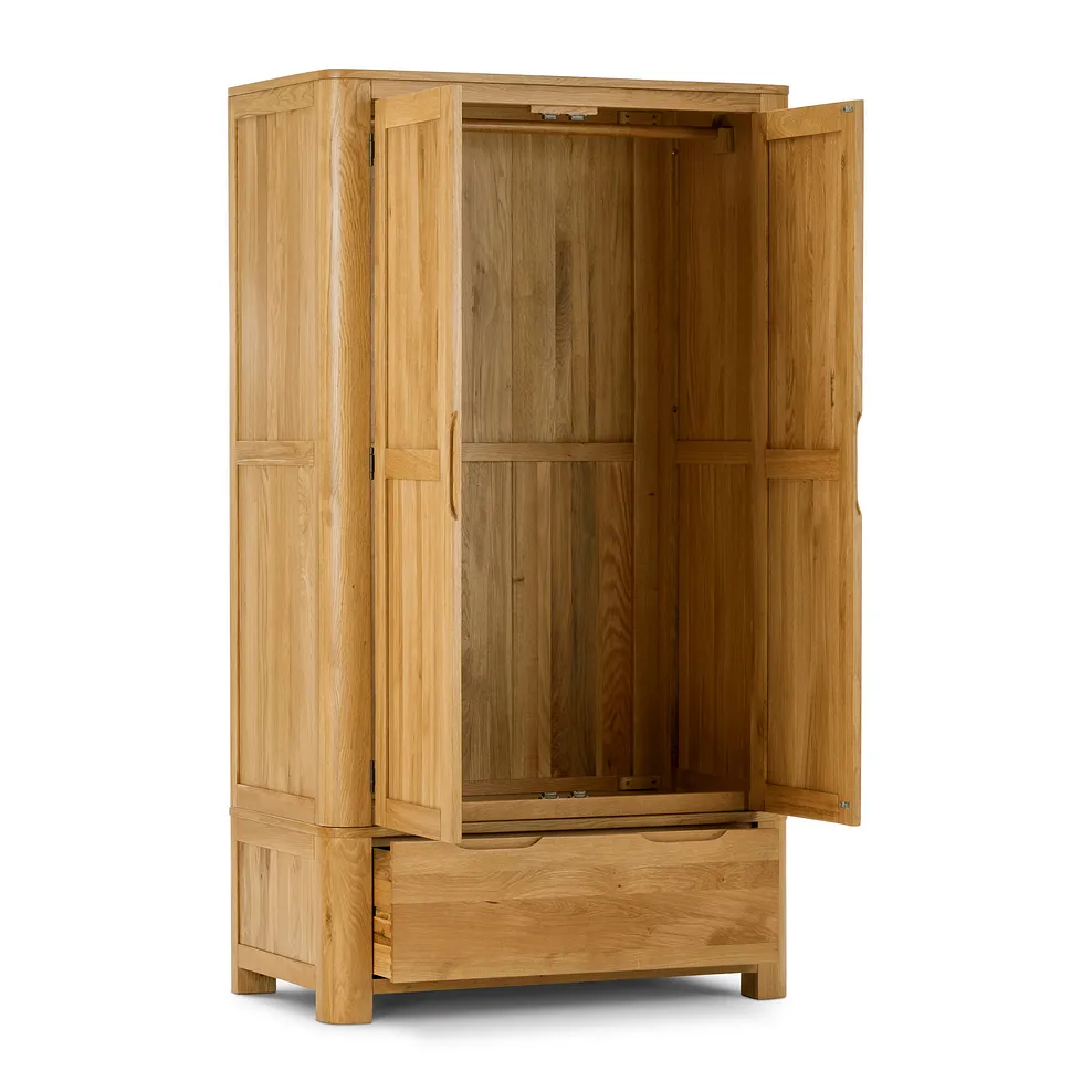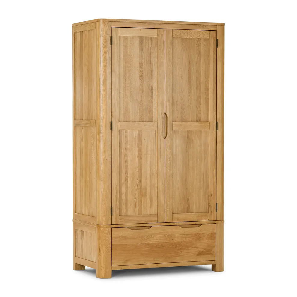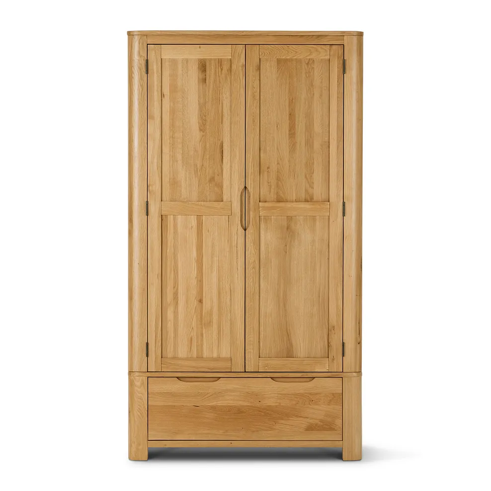 The Romsey double wardrobe is a stylish addition to any bedroom, featuring a soft, friendly design, ideal in modern family homes. Made from beautiful solid oak, Romsey boasts our natural finish, which adds a protective sheen to the oak that emphasizes the unique grain patterns. Signature to the range are the rounded corners, and carved recessed handles, which add to the simplicity of each piece. This wardrobe boasts a double hanging area, with a wide flat-fronted drawer below for additional storage. As with all of our furniture, the Romsey double wardrobe is finished with the highest attention to detail, including dovetail joints on the drawer, and solid oak bases, backs, and runners. Bring Romsey home today – and don’t forget about our great delivery options too! Browse our full collection to find more stylish Romsey pieces for your bedroom.