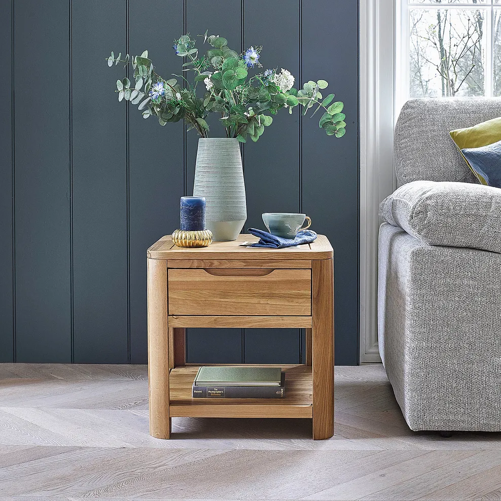 A great piece to finish off your living room style, our Romsey side table with drawer has been designed with modern family homes in mind. It has an appealing simple shape, with a lower storage shelf, flat-fronted drawer, sculpted recessed handle, and cheerful rounded corners. The drawer is made with our high quality standards in mind, boasting real dovetail joints, as well as solid oak bases, backs, and runners that will stand the test of time. Romsey is crafted from 100% solid oak, and finished with our natural protective wax. This helps to nourish the wood and brings out the individual grain patterns, as well as emphasising the warm and sunny tones of oak. We have a great range of matching living room furniture in our full Romsey collection.