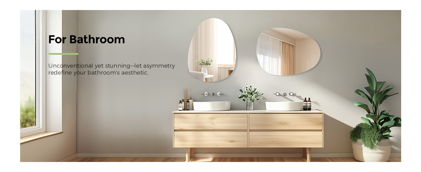 With its asymmetrical, frameless design, this wall mounted mirror becomes a stylish focal point in bathrooms, bedrooms, or hallways. The clean silhouette suits modern, Scandinavian, or artistic interiors.