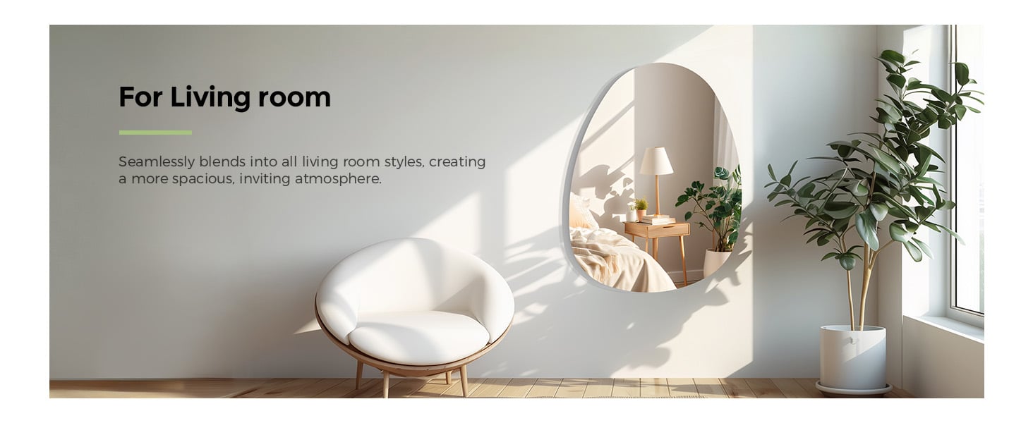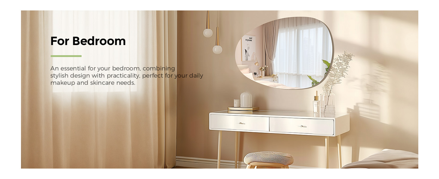 With its asymmetrical, frameless design, this wall mounted mirror becomes a stylish focal point in bathrooms, bedrooms, or hallways. The clean silhouette suits modern, Scandinavian, or artistic interiors.