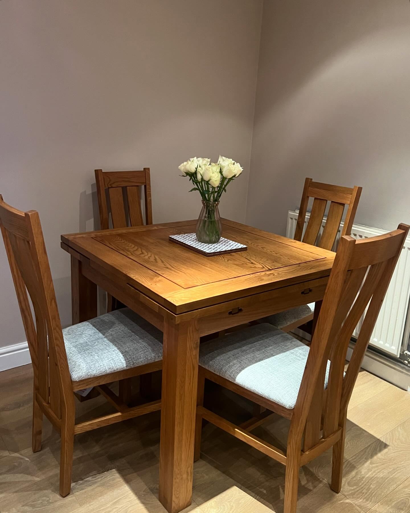 Designed for those with smaller families the 3ft x 3ft Sherwood Extending Dining Table offers the option of a more compact table whilst still retaining the ability to extend when required for those special occasions. Designed with a minimalist style to allow the quality of the wood to take centre stage, the oak has simply been treated with a subtly stained wax to give the table the rustic finish it is named after. The table utilises a simple extending mechanism whereby leaves at each end of the table are pulled out from underneath the table, lifted up and pushed into grooves to lock into place. Then when no longer required, the process is simply reversed so that the leaves are hidden neatly away under the table. We never skimp on materials so the table is made using only 100% oak