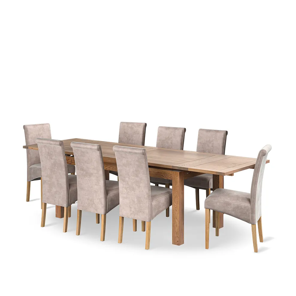 The perfect addition to any oak dining table, our modern scroll-back chairs feature solid oak legs and are upholstered in Vintage Tan leather-look fabric for added style and comfort. The high-back design offers cushioning to support your back, while the upholstered finish brings a stylish touch to your dining space.