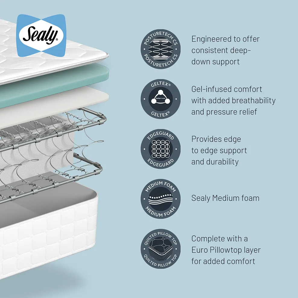 In addition to this layer, the Silverdale mattress benefits from Sealy€™s PostureTech technology, comprising a network of tempered springs deep within the mattress. Paired with medium foam and a cosy quilted top layer, each sleeper can enjoy edge-to-edge support, regardless of whether they prefer to lie on their back, front or side.