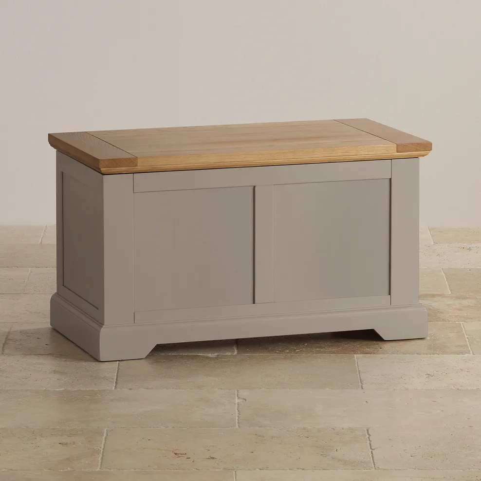 A strong solid hardwood blanket box with an elegant, light grey paint finish on the body, and beautiful natural oak lid. A blanket box is useful storage to have around the home, for shoes in the hall, toys in the living room, or spare bedclothes and blankets upstairs in the bedroom. With its solid construction, the St Ives blanket box could be used as a window seat or coffee table.