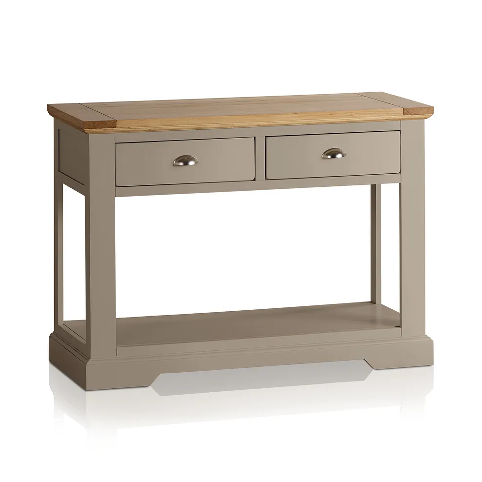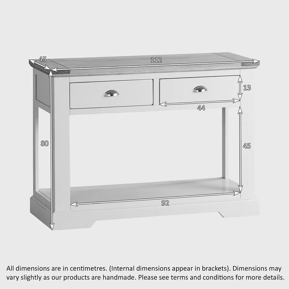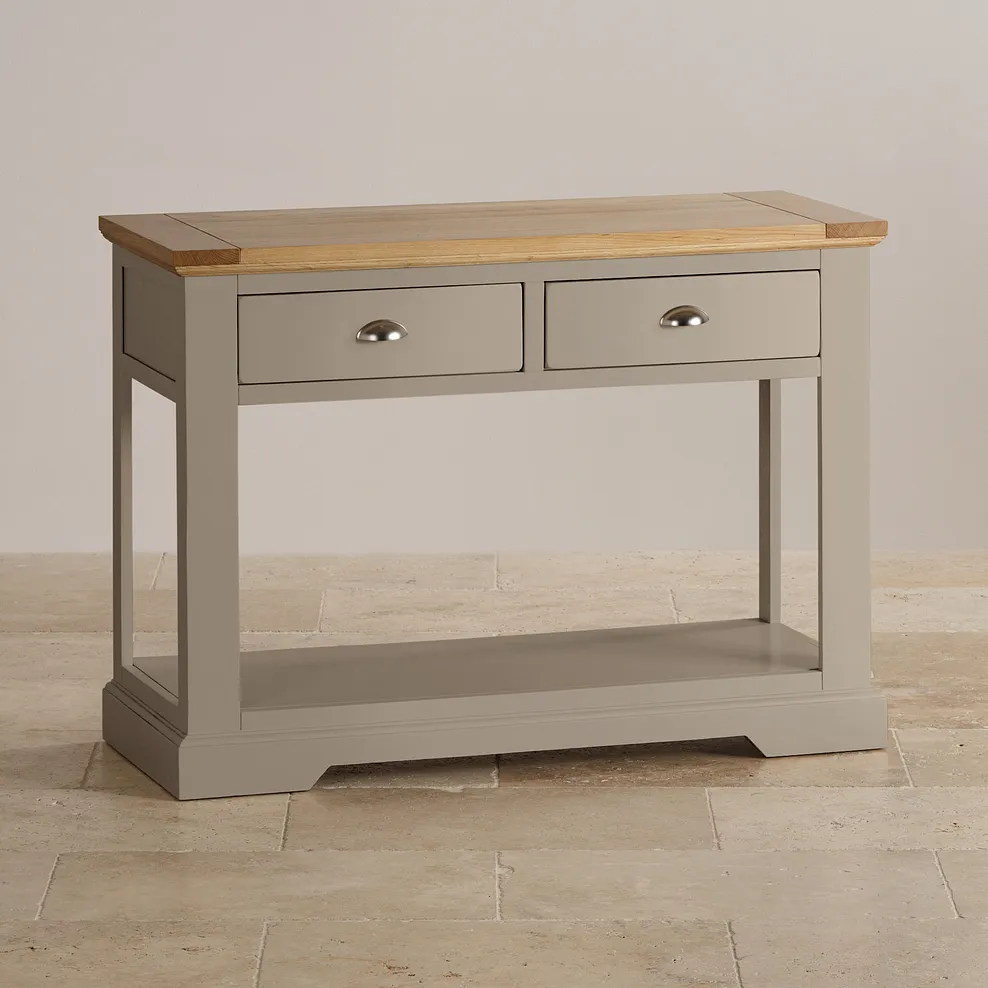 This grey console table can be used in many rooms, adding style to your home. The two drawers give extra storage, always useful in the sitting room, dining room, or kitchen. Placed behind a sofa, it could be used as a base for a display, or to hold a lamp. This grey console table is such a sturdy piece of furniture that it will also serve as a desk or dressing table.
