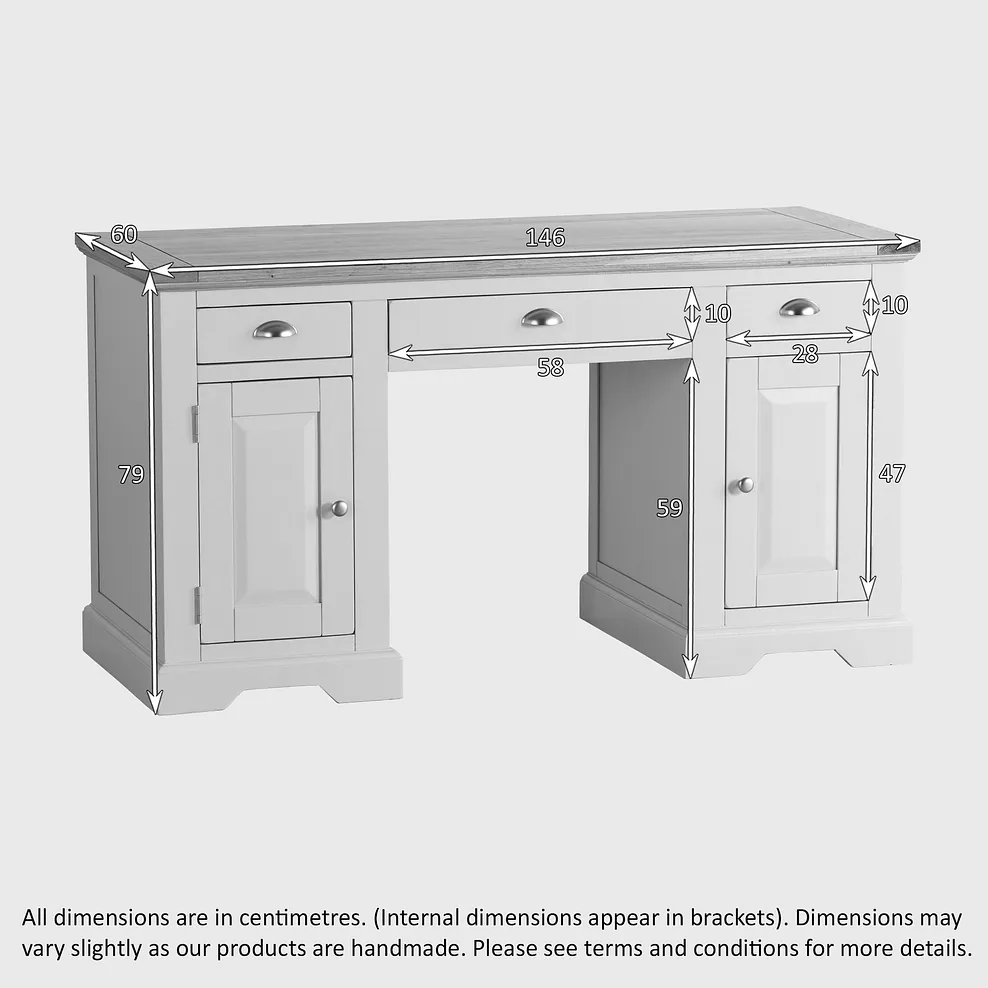 The St Ives desk will be ideal in your home office or study. Two shelved cupboards sit either side of a central drawer. Designed with a home computer in mind, holes have been cut at the back to make any routing of cables easier.