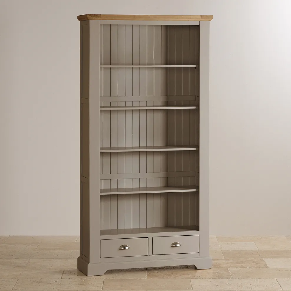 A stunning grey bookcase that will add character to a room, just right for showing favourite books, ornaments, and photographs. With sturdy bracket feet, the solid hardwood case has tongue and groove construction, painted light grey to complement the natural solid oak top. With five display shelves, two drawers at the base add stability and are good for tidying muddle away. The elegant painted finish gives the St Ives range a modern feel, and can be placed with other pieces from the range. This grey bookcase will work in a home office, or as a statement piece in the kitchen.