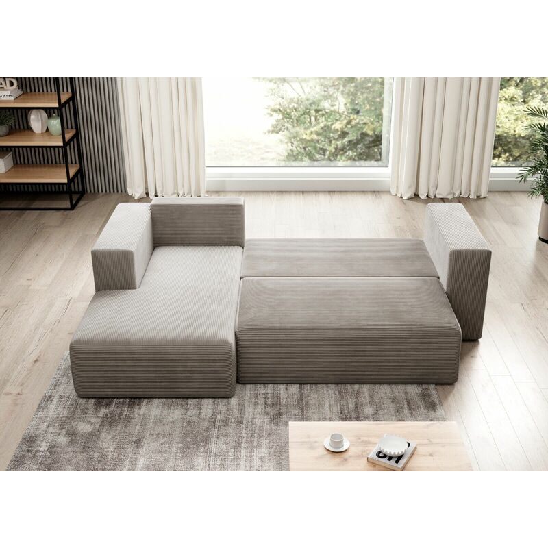 Our Stripes Corner Sofa bed is a modern piece of furniture, ideal for the living room, guest room, playroom or conservatory. This sofa is made of top upholstery in this season, cord. This fabric is super soft and cosy. The sofa transforms into a bed very easily. The mattress of the sofa is medium firm. The sofa contains one storage compartment. Please check the dimensions before purchasing. This sofa comes in two pieces with attached arms, so please ensure your entrance is big enough for this sofa to go in.
