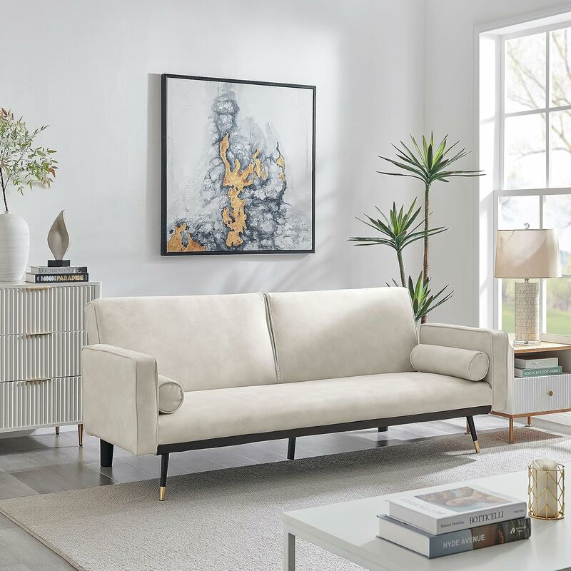 • JENNA SOFA BED: This luxury sofa bed offers style and practicality to your home, and is the perfect space saving solution for any living space. With stylish black and gold legs, and a convenient click clack mechanism, you can seamlessly transform a modern seating option to a comfortable bed.