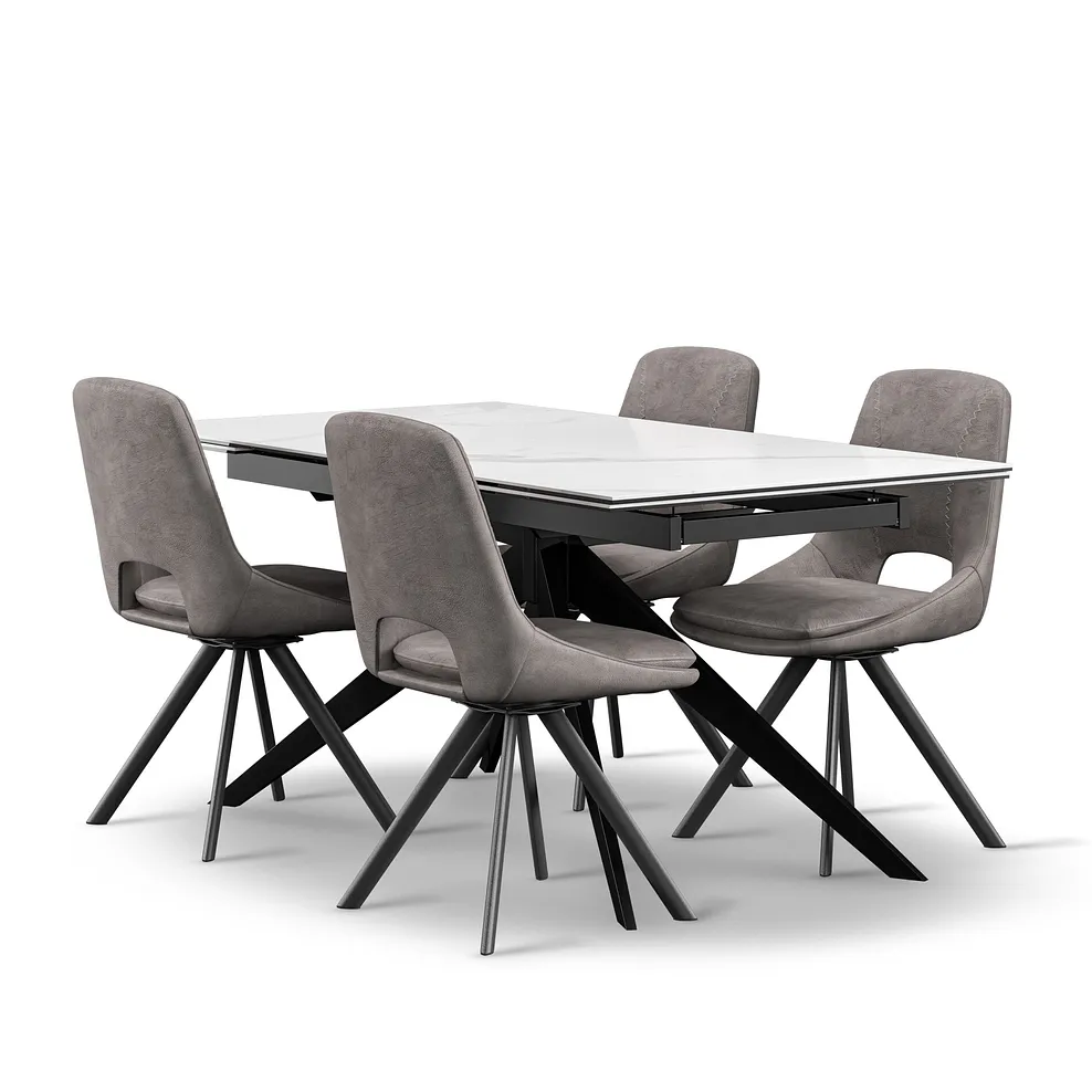 Our beautiful Trento dining table range is designed to offer style, resilience, and adaptability for your modern dining room or kitchen. Paired here with 4 beautiful Dark Grey Nico swivel chairs for added comfort and sophistication. From the heat, scratch, and chip-resistant surface to the black powder-coated legs and easy extend mechanism; the Trento dining table was made with the modern family in mind.