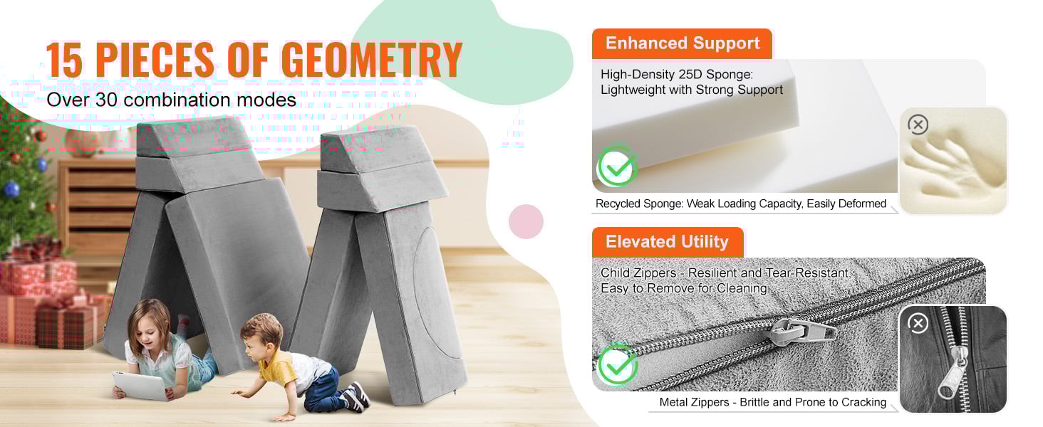 - Over 30 Combination Modes: With up to 15 geometric components, this kids couch set offers more freedom and creativity. Beyond the provided 20 common combinations in the manual, children can unleash their imagination to create a wide variety of shapes and objects, sparking their creativity.