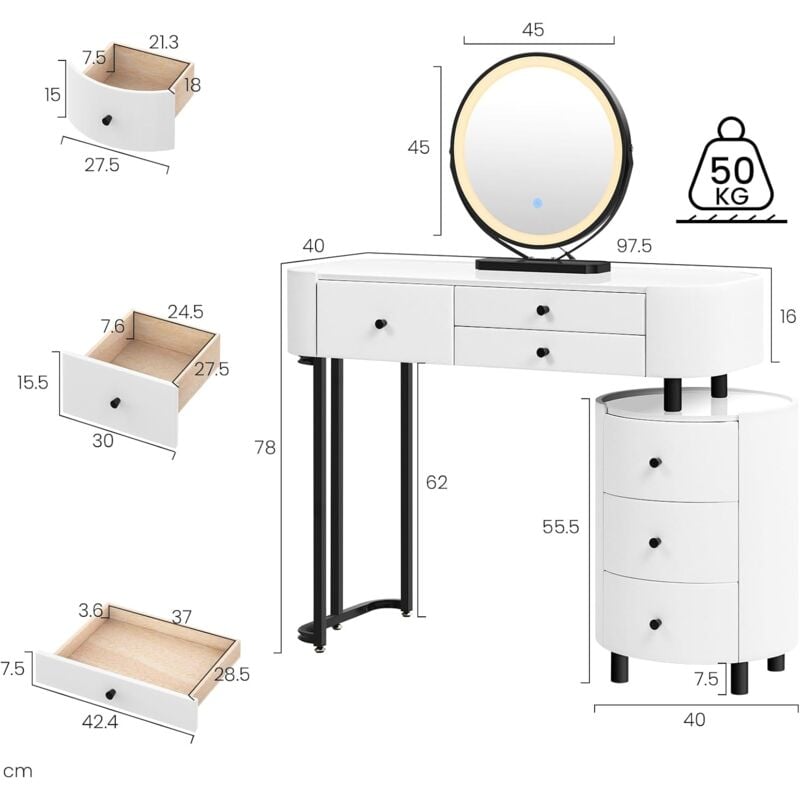 - MIRROR WITH LED LIGHTING: The round mirror (φ40cm) on the dressing table can be swivelled 360° and moved freely, which also has an LED light strip with USB port, adjustable to 3 colour temperature levels with a simple press of the button and 10 brightness levels with a long press to provide the right light for your skincare and makeup routine