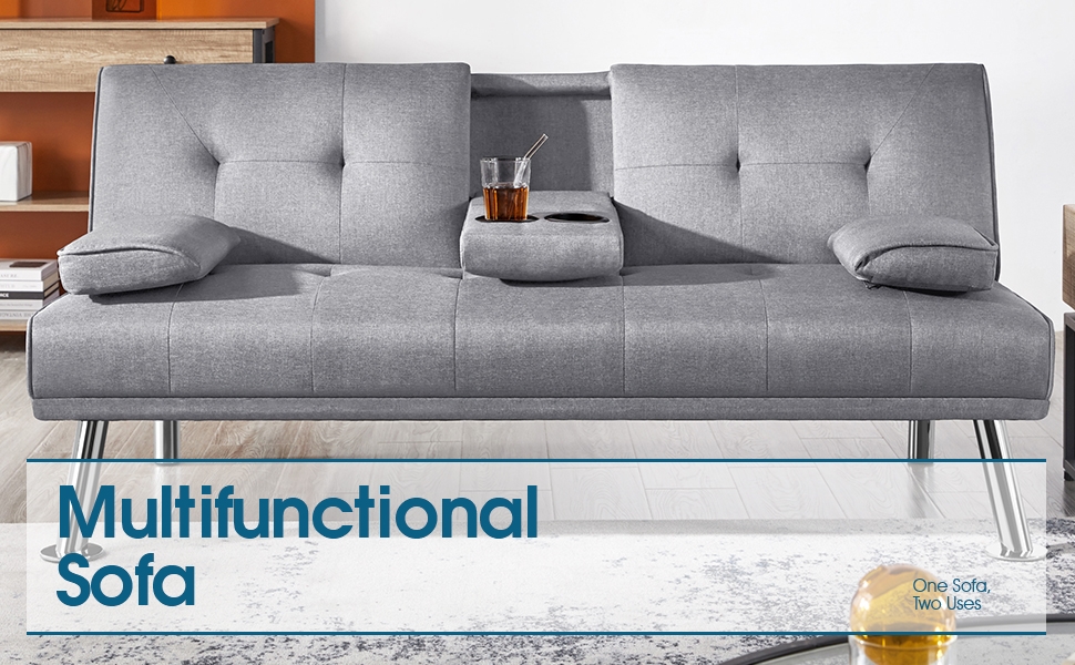 This 3-in-1 sofa bed features an adjustable back that can easily lock at three positions (105°, 140°, 180°), transforming from a regular futon to a reclined sofa to a 167 cm W — 94 cm D platform bed depending on the moment’s needs. Made of Chrome-plated steel legs and an engineered wood frame, this sofa bed features a resilient foam fill and durable polyester upholstery for years of comfort. For even more function, this convertible sofa bed has a convenient drop-down platform with two cup holders to create a temporary and handy surface for drinks and snacks. Thanks to the transformable structure and compact size, this upholstered sofa bed is perfect for small apartments, studios, offices, dorms, condos, cramped living rooms, and other limited spaces. Simple assembly is required.
