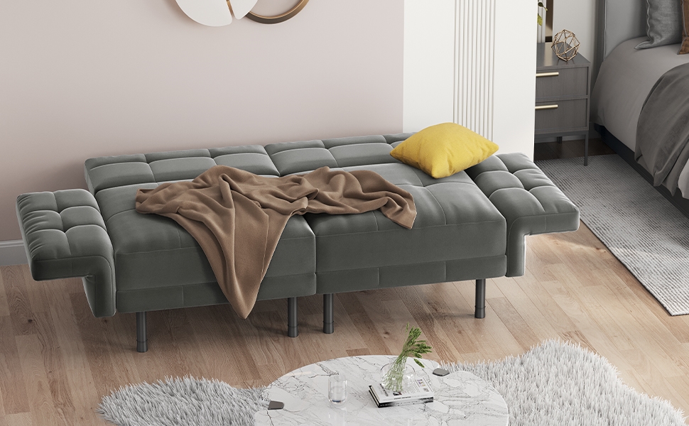 3.Smooth & Elegant‘Dressed in lavish velvet, this convertible sofa bed exudes luxury and offers a delightfully soft touch. The sumptuous fabric ensures a cozy lounging experience, while its elegant texture adds warmth and sophistication to your living space.